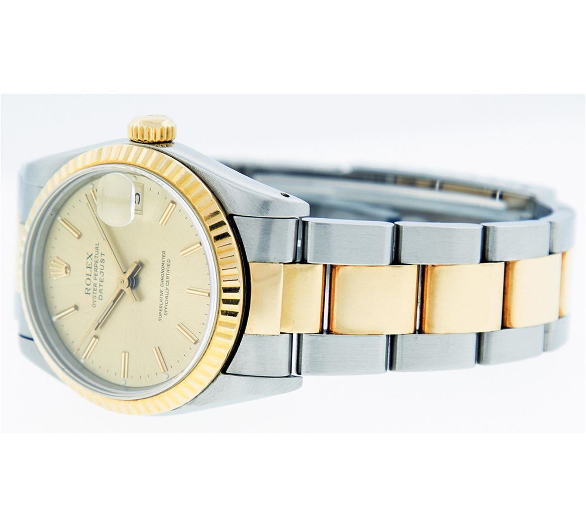 One Ladies Two Tone Rolex Datejust Polished, Serviced & Electronically Tested, Stainless Steel Case Case:31mm, Yellow Gold Crown, Bezel: Yellow Gold Fluted Bezel, Custom Crystal: Acrylic Cyclops Lens. Movement: Automatic Winding Movement Caliber 2135. Custom Dial: Champagne Index With Line Track. Date Window: 3 O'Clock Position Date Display, Quickset, Model: Midsize Datejust. Condition: G-6 Extra Fine. Bracelet: Two Tone Oyster Band. Bright Polish. 6.0 Inch Length, Adjustable. Standard Clasp, With Rolex Logo.