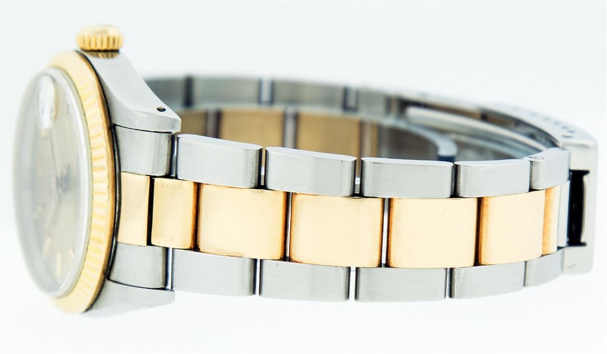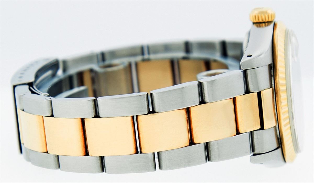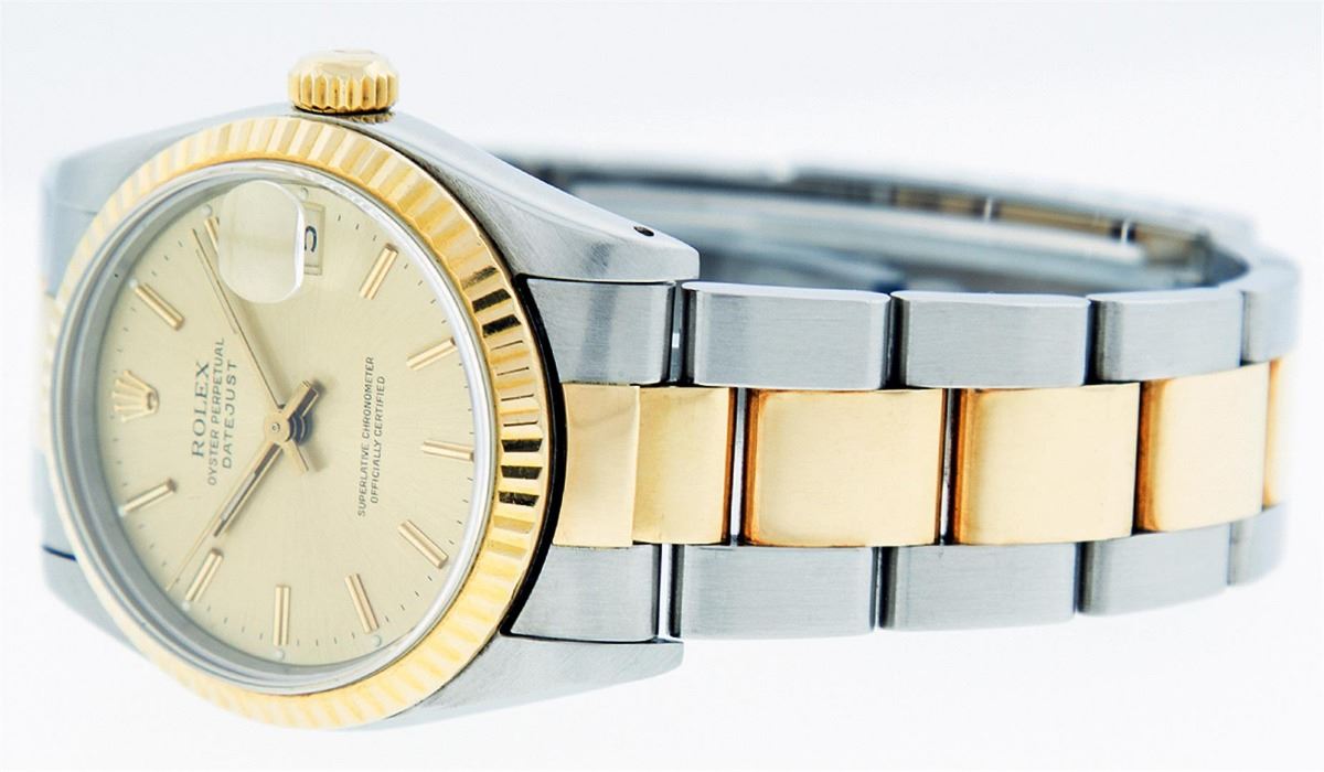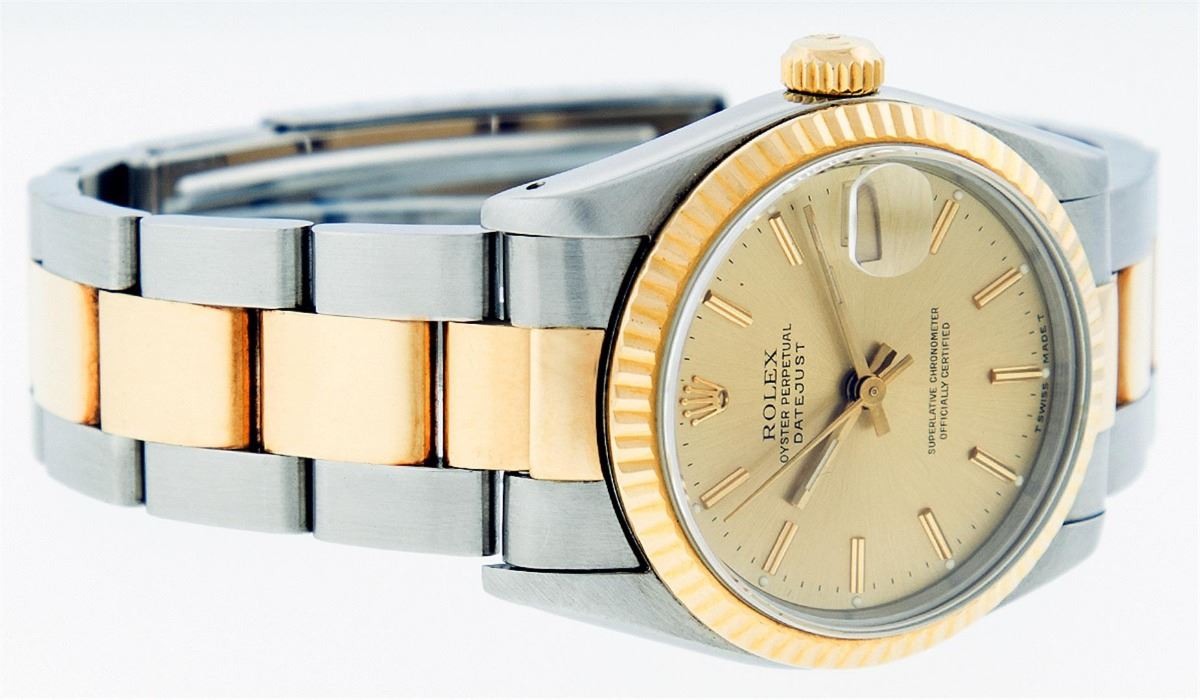 One Ladies Two Tone Rolex Datejust Polished, Serviced & Electronically Tested, Stainless Steel Case Case:31mm, Yellow Gold Crown, Bezel: Yellow Gold Fluted Bezel, Custom Crystal: Acrylic Cyclops Lens. Movement: Automatic Winding Movement Caliber 2135. Custom Dial: Champagne Index With Line Track. Date Window: 3 O'Clock Position Date Display, Quickset, Model: Midsize Datejust. Condition: G-6 Extra Fine. Bracelet: Two Tone Oyster Band. Bright Polish. 6.0 Inch Length, Adjustable. Standard Clasp, With Rolex Logo.