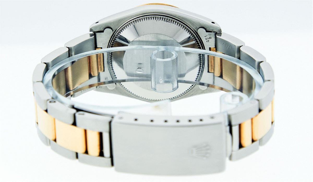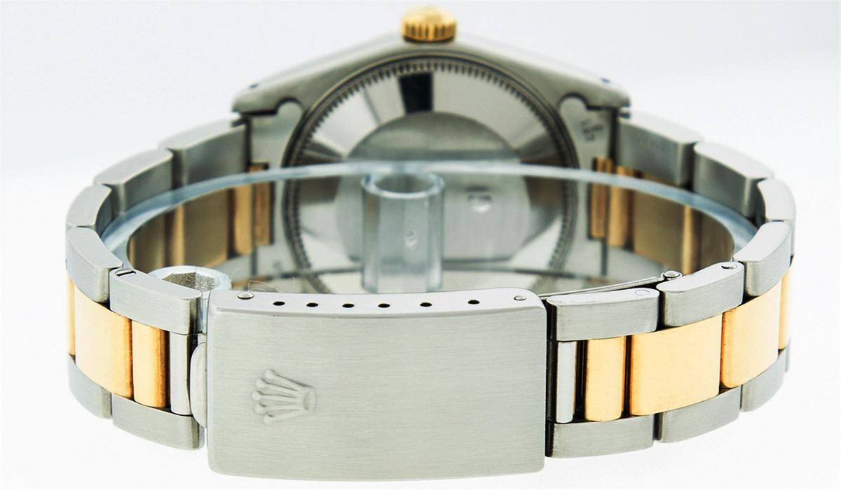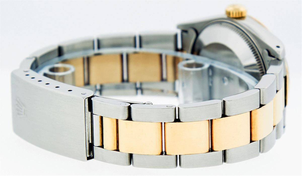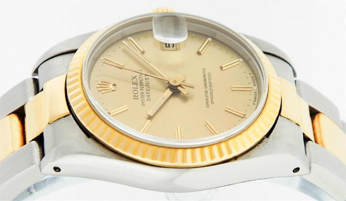 One Ladies Two Tone Rolex Datejust Polished, Serviced & Electronically Tested, Stainless Steel Case Case:31mm, Yellow Gold Crown, Bezel: Yellow Gold Fluted Bezel, Custom Crystal: Acrylic Cyclops Lens. Movement: Automatic Winding Movement Caliber 2135. Custom Dial: Champagne Index With Line Track. Date Window: 3 O'Clock Position Date Display, Quickset, Model: Midsize Datejust. Condition: G-6 Extra Fine. Bracelet: Two Tone Oyster Band. Bright Polish. 6.0 Inch Length, Adjustable. Standard Clasp, With Rolex Logo.