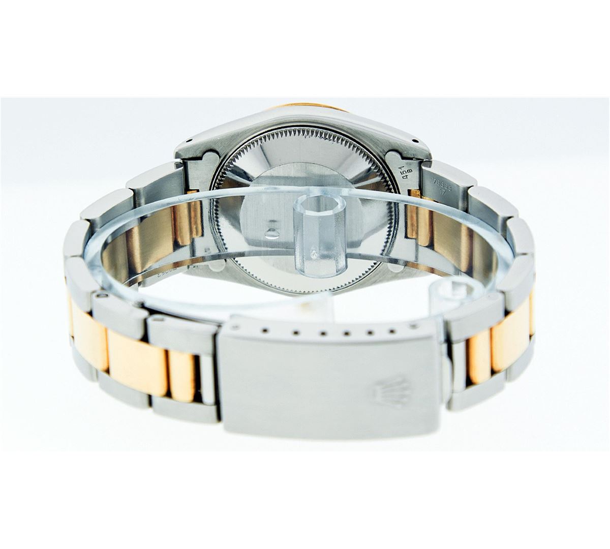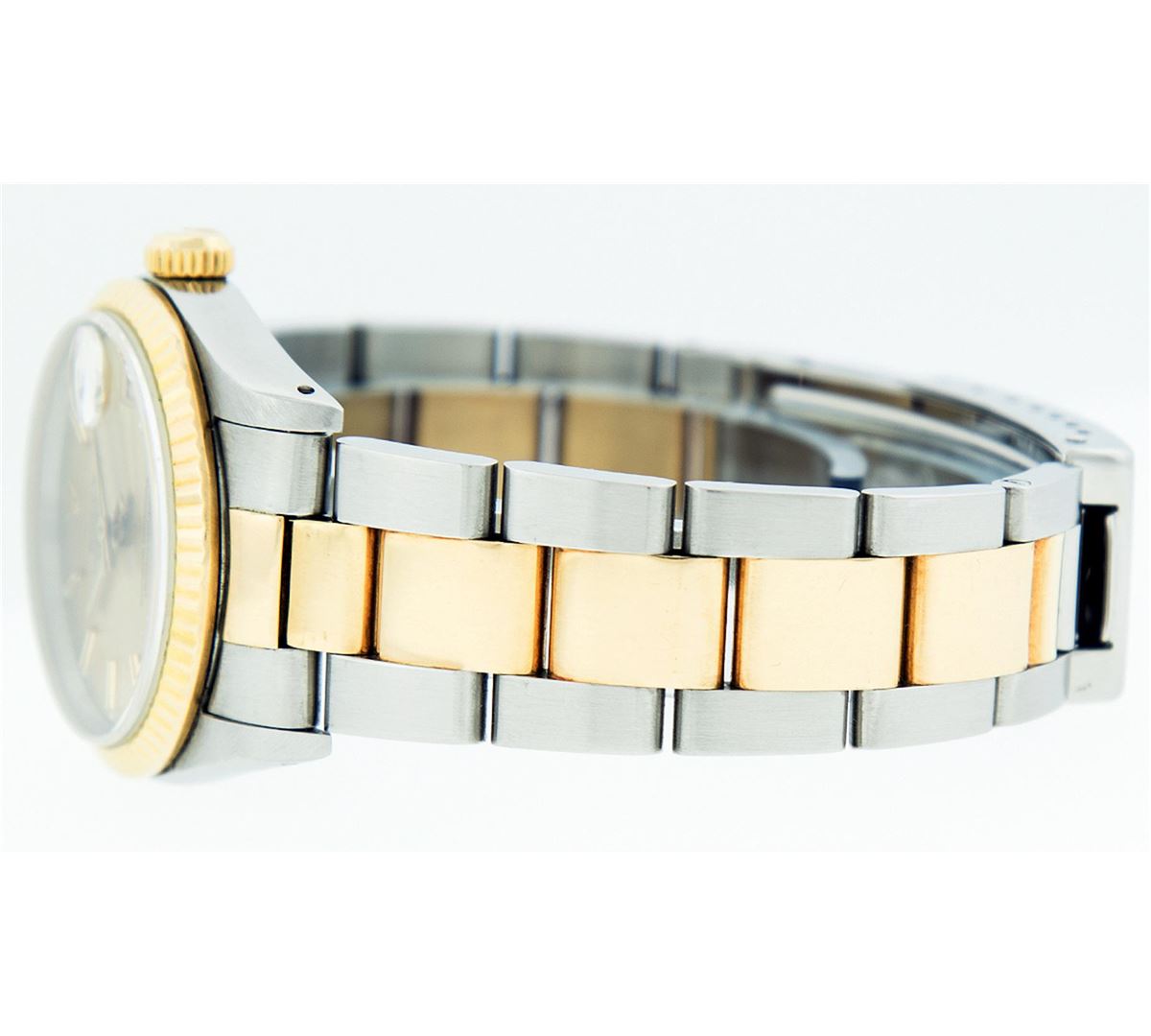 One Ladies Two Tone Rolex Datejust Polished, Serviced & Electronically Tested, Stainless Steel Case Case:31mm, Yellow Gold Crown, Bezel: Yellow Gold Fluted Bezel, Custom Crystal: Acrylic Cyclops Lens. Movement: Automatic Winding Movement Caliber 2135. Custom Dial: Champagne Index With Line Track. Date Window: 3 O'Clock Position Date Display, Quickset, Model: Midsize Datejust. Condition: G-6 Extra Fine. Bracelet: Two Tone Oyster Band. Bright Polish. 6.0 Inch Length, Adjustable. Standard Clasp, With Rolex Logo.