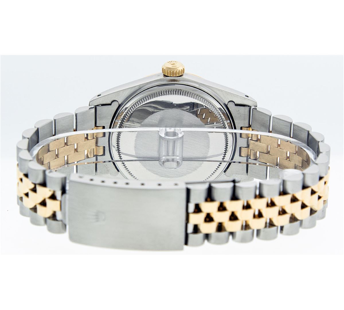 One Mens Two Tone Rolex Datejust Polished, Serviced & Electronically Tested, 14K Yellow Gold & Stainless Steel Case: 36mm,14K Yellow Gold Crown, Bezel: 14K Yellow Gold Fluted Bezel. Custom Crystal: Acrylic Cyclops Lens. Movement: Automatic Winding Movement Caliber 3035. Dial: Champagne Dial With Index Hour Markers and Small Track. Date Window: 3 O'Clock Position Date Display, Quickset, Model: 16013 Condition: G-6 Extra Fine. Bracelet: Two Tone 14K Yellow Gold & Stainless Steel Jubilee. Bright Polish. 7.0 Inch Length, Adjustable. Standard Clasp, With Rolex Logo. Comes with 6 month warranty.