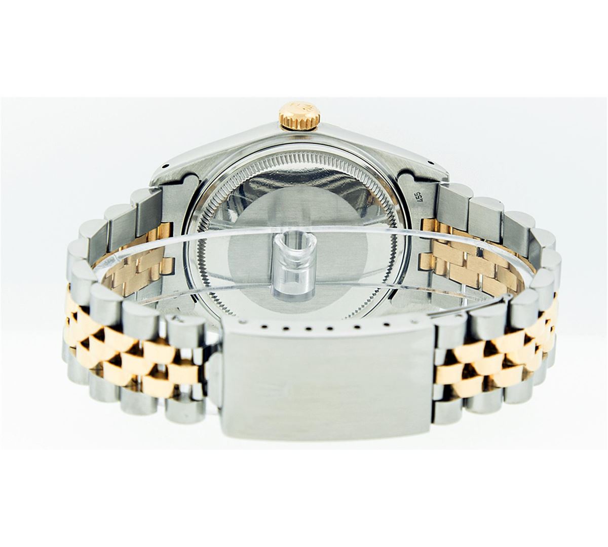 One Mens Two Tone Rolex Datejust Polished, Serviced & Electronically Tested, 14K Yellow Gold & Stainless Steel Case: 36mm,14K Yellow Gold Crown, Bezel: 14K Yellow Gold Fluted Bezel. Custom Crystal: Acrylic Cyclops Lens. Movement: Automatic Winding Movement Caliber 3035. Dial: Champagne Dial With Index Hour Markers and Small Track. Date Window: 3 O'Clock Position Date Display, Quickset, Model: 16013 Condition: G-6 Extra Fine. Bracelet: Two Tone 14K Yellow Gold & Stainless Steel Jubilee. Bright Polish. 7.0 Inch Length, Adjustable. Standard Clasp, With Rolex Logo. Comes with 6 month warranty.