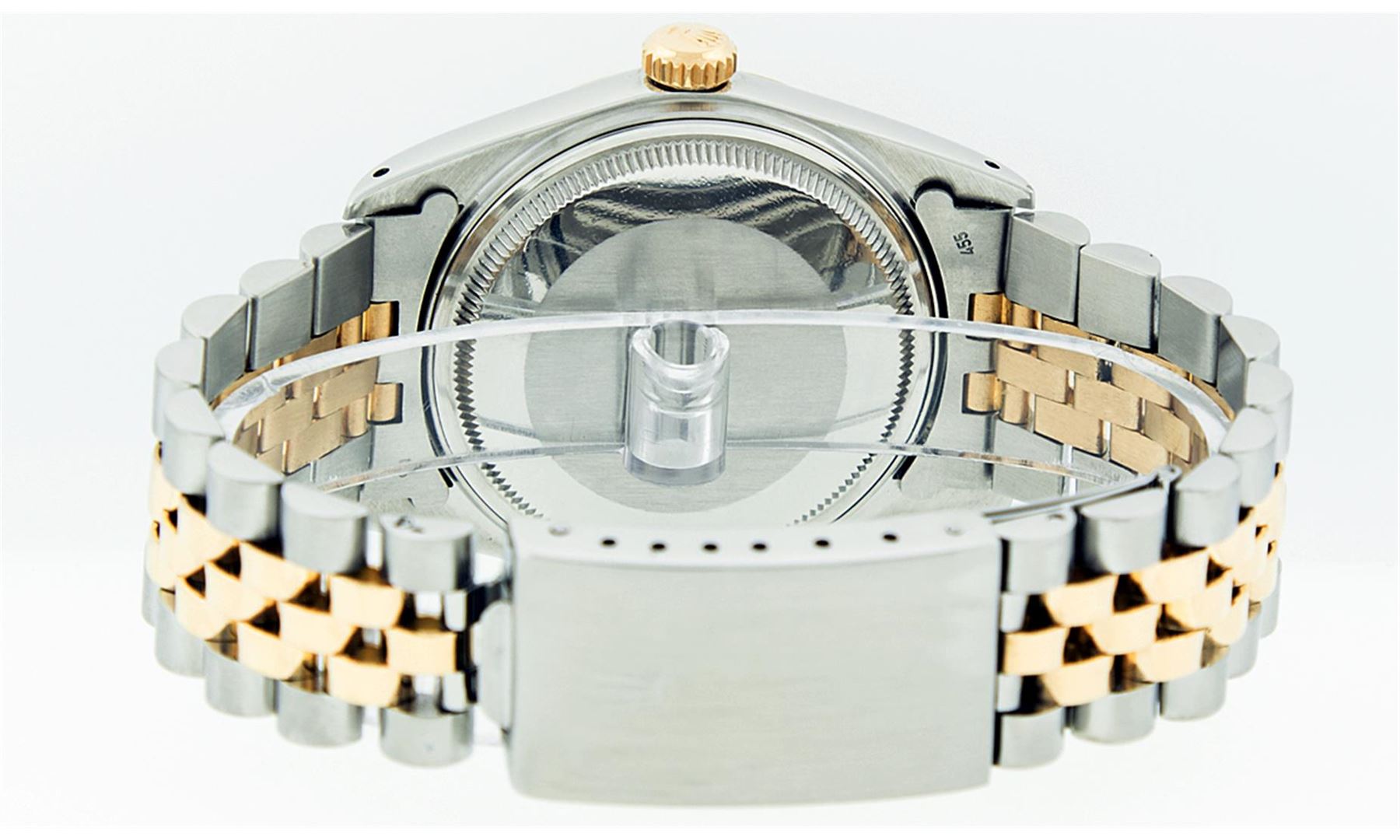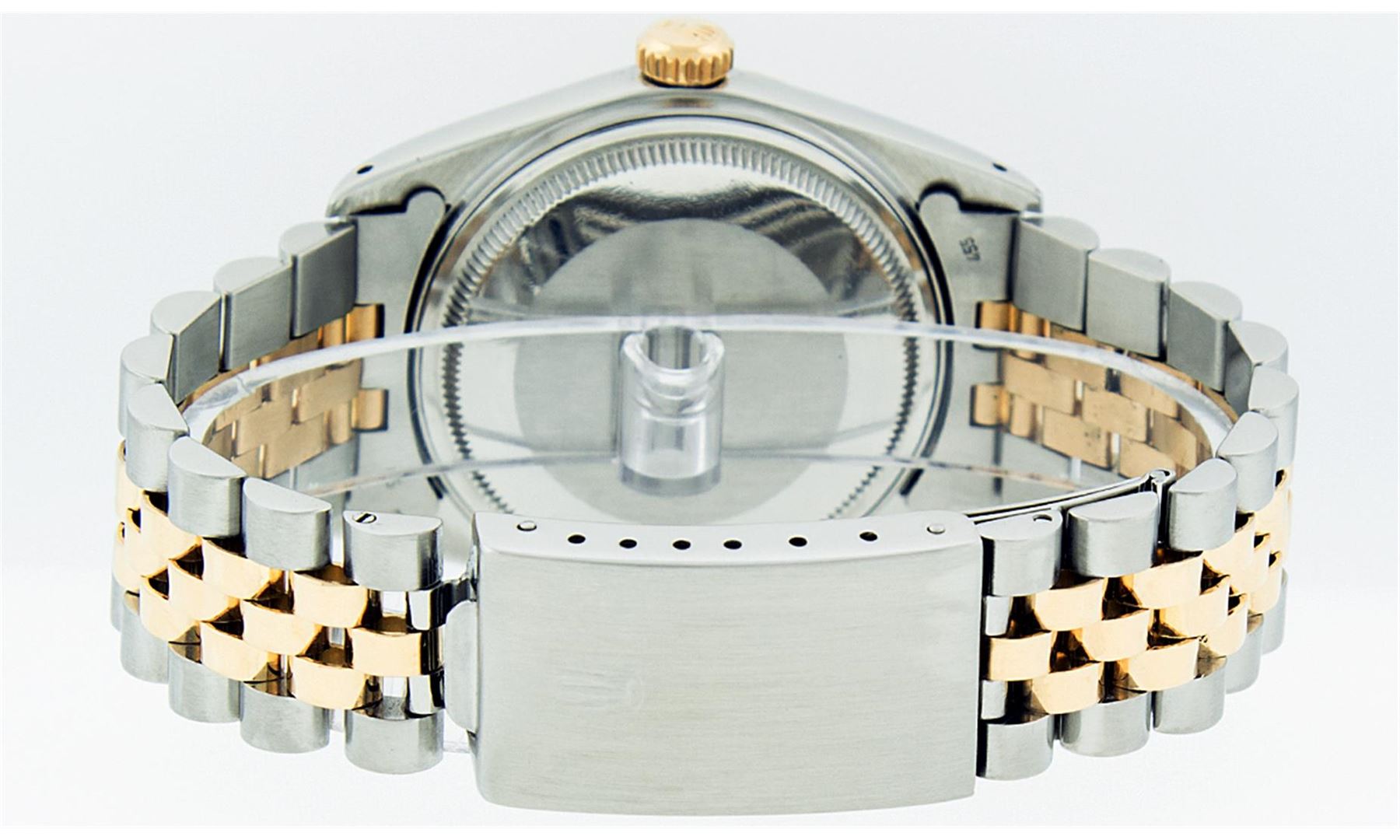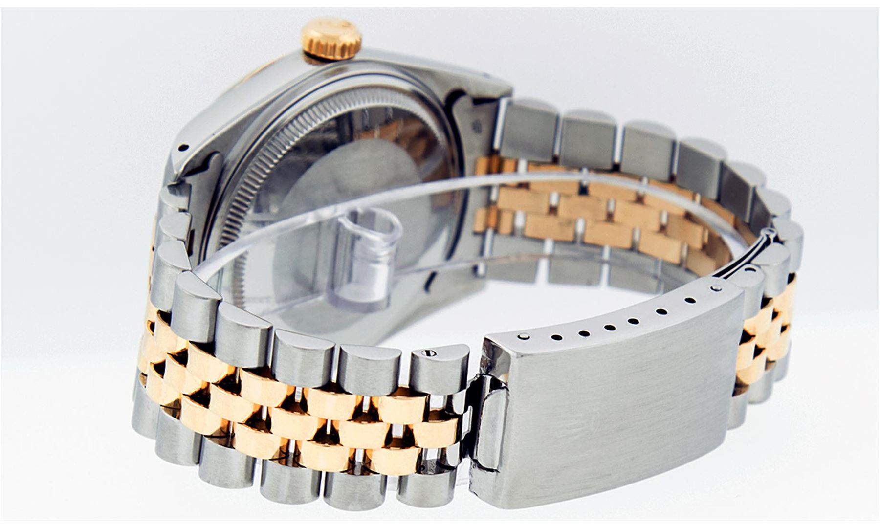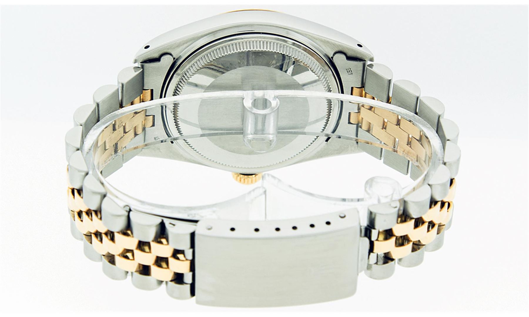 One Mens Two Tone Rolex Datejust Polished, Serviced & Electronically Tested, 14K Yellow Gold & Stainless Steel Case: 36mm,14K Yellow Gold Crown, Bezel: 14K Yellow Gold Fluted Bezel. Custom Crystal: Acrylic Cyclops Lens. Movement: Automatic Winding Movement Caliber 3035. Dial: Champagne Dial With Index Hour Markers and Small Track. Date Window: 3 O'Clock Position Date Display, Quickset, Model: 16013 Condition: G-6 Extra Fine. Bracelet: Two Tone 14K Yellow Gold & Stainless Steel Jubilee. Bright Polish. 7.0 Inch Length, Adjustable. Standard Clasp, With Rolex Logo. Comes with 6 month warranty.