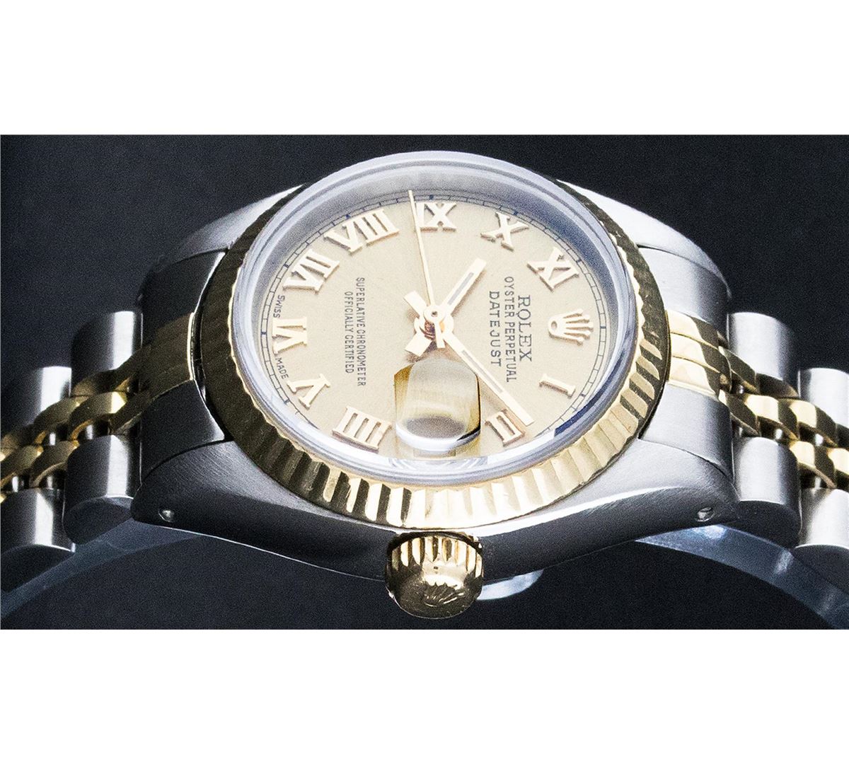 One Ladies Two Tone Rolex Datejust Polished, Serviced & Electronically Tested, 14K Yellow Gold & Stainless Steel Case:26mm, 14K Yellow Gold Crown, Bezel: 14K Yellow Gold Fluted Bezel. Custom Crystal: Acrylic Cyclops Lens. Movement: Automatic Winding Movement Caliber 2030. Custom Champagne Roman Dial. Date Window: 3 O'Clock Position Date Display, Non Quickset, Model: 6917 Condition: G-6 Extra Fine. Bracelet: Two Tone 14K Yellow Gold & Stainless Steel Jubilee. Bright Polish. 5.5 Inch Length, Adjustable. Standard Clasp, With Rolex Logo.