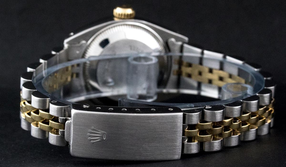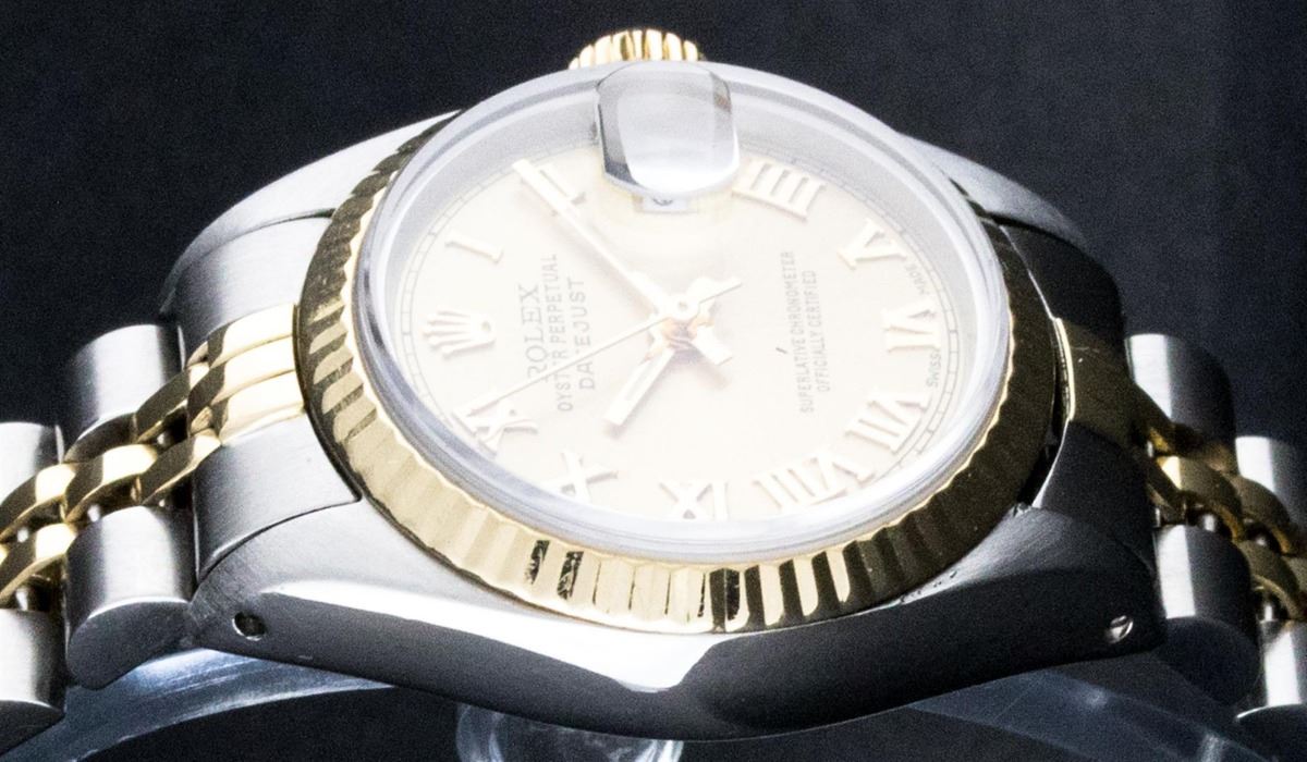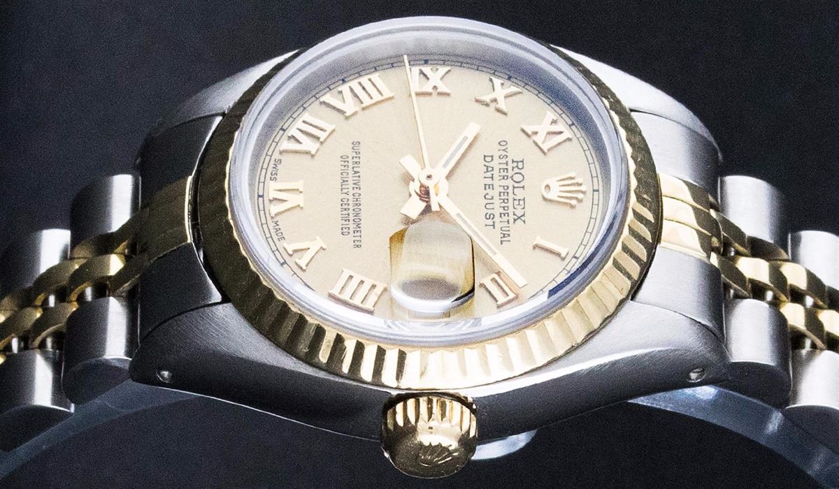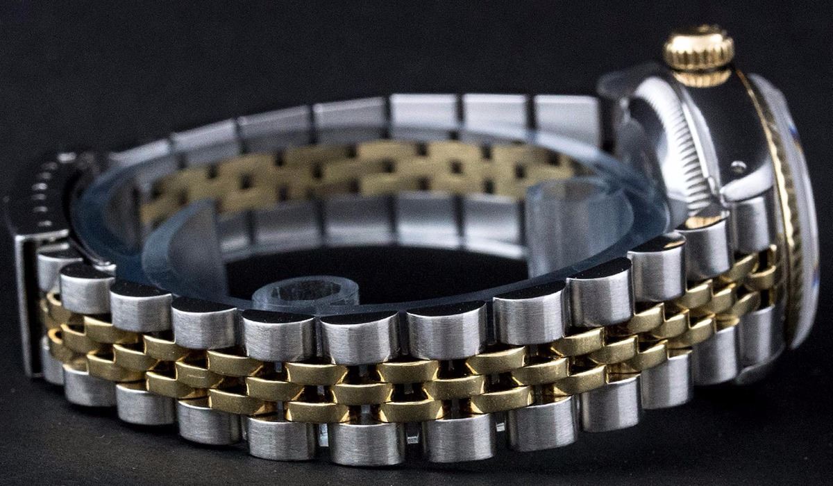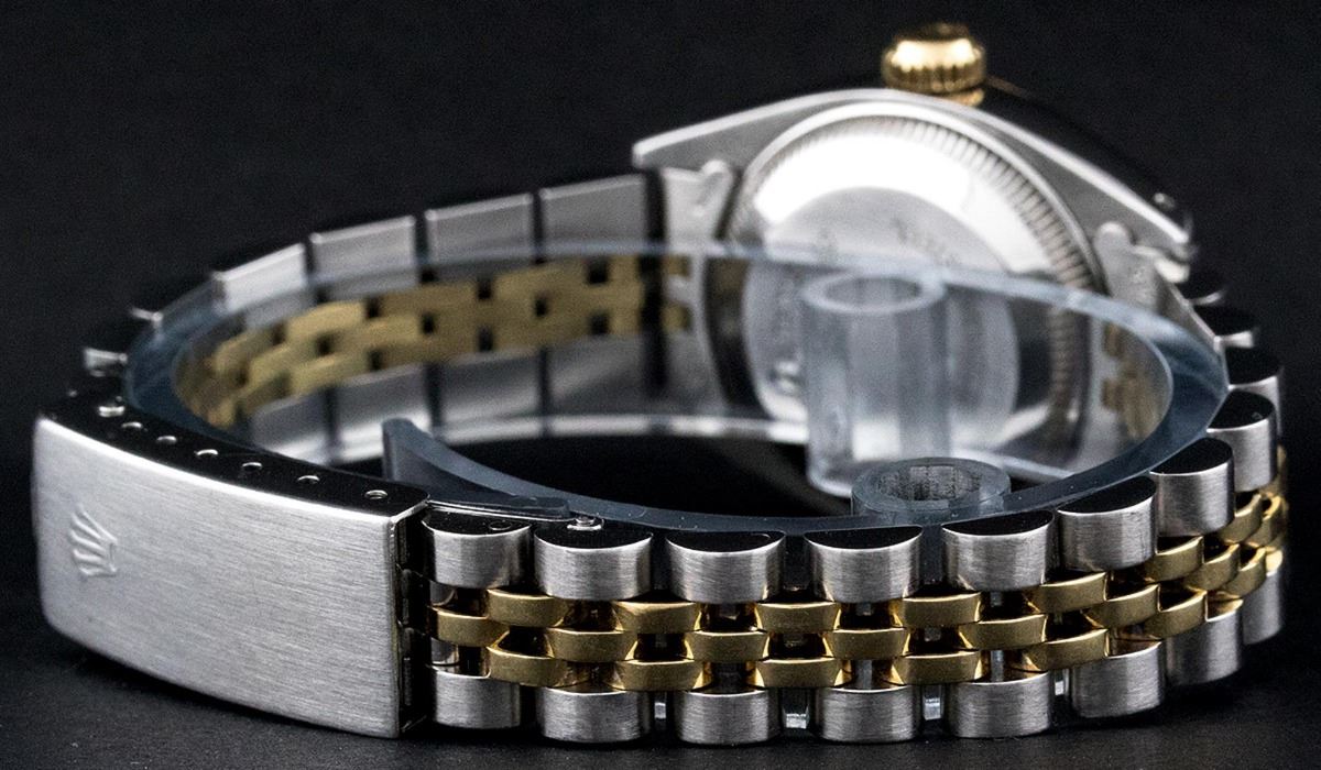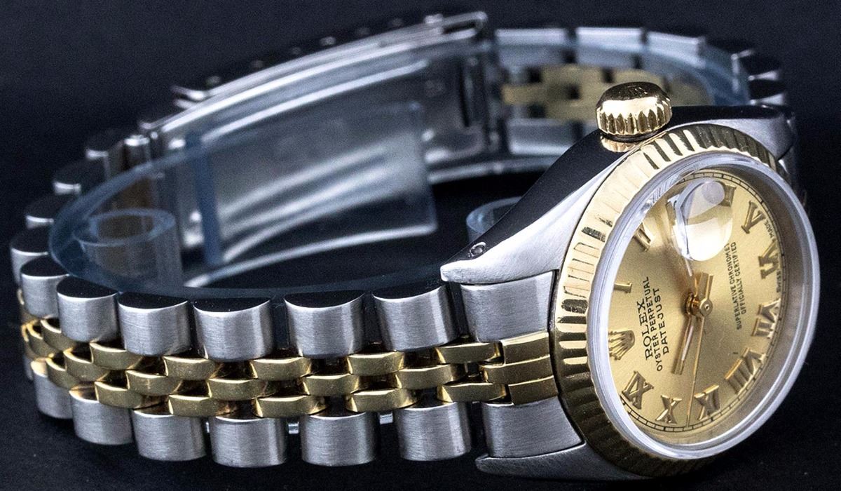 One Ladies Two Tone Rolex Datejust Polished, Serviced & Electronically Tested, 14K Yellow Gold & Stainless Steel Case:26mm, 14K Yellow Gold Crown, Bezel: 14K Yellow Gold Fluted Bezel. Custom Crystal: Acrylic Cyclops Lens. Movement: Automatic Winding Movement Caliber 2030. Custom Champagne Roman Dial. Date Window: 3 O'Clock Position Date Display, Non Quickset, Model: 6917 Condition: G-6 Extra Fine. Bracelet: Two Tone 14K Yellow Gold & Stainless Steel Jubilee. Bright Polish. 5.5 Inch Length, Adjustable. Standard Clasp, With Rolex Logo.