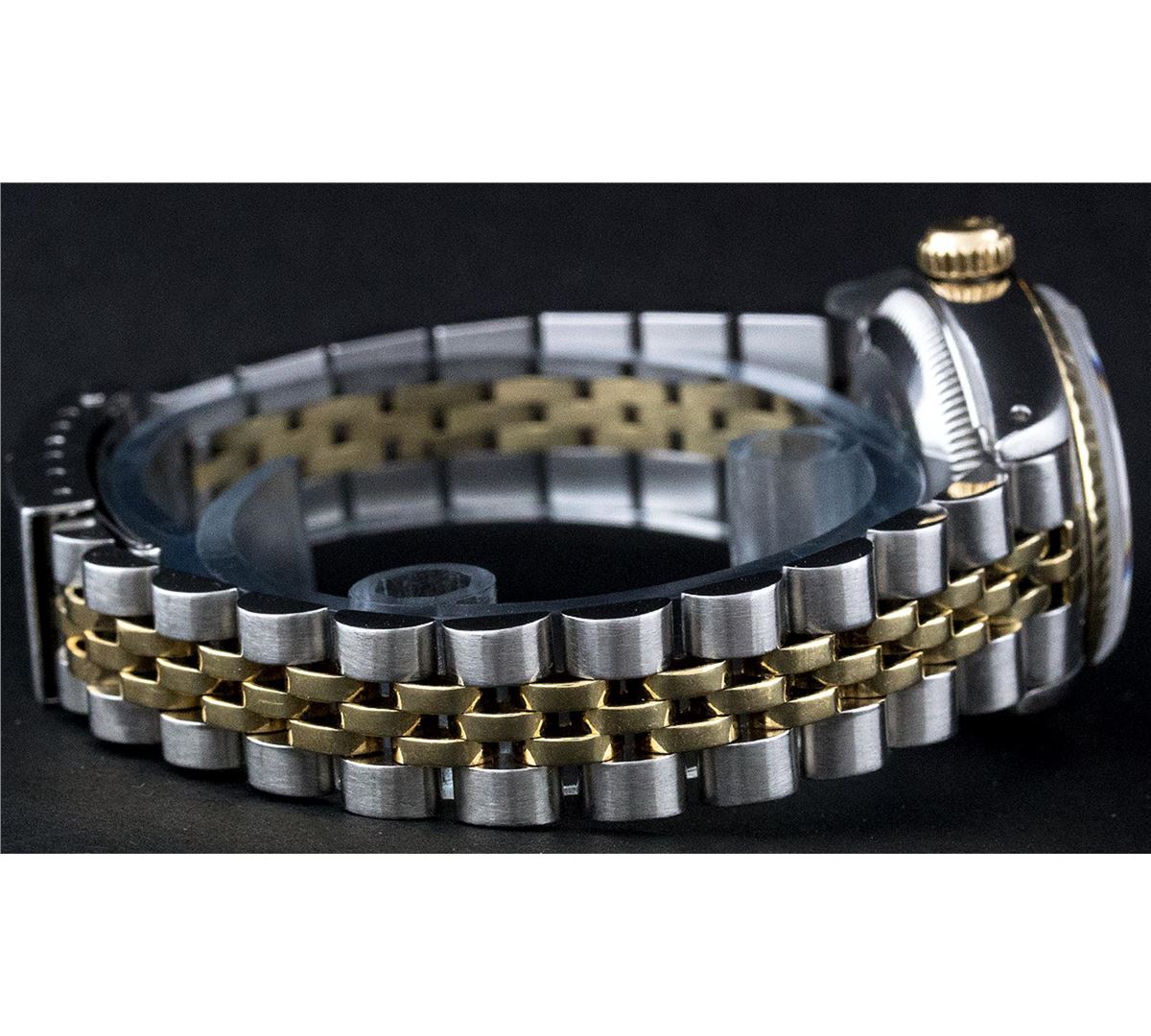 One Ladies Two Tone Rolex Datejust Polished, Serviced & Electronically Tested, 14K Yellow Gold & Stainless Steel Case:26mm, 14K Yellow Gold Crown, Bezel: 14K Yellow Gold Fluted Bezel. Custom Crystal: Acrylic Cyclops Lens. Movement: Automatic Winding Movement Caliber 2030. Custom Champagne Roman Dial. Date Window: 3 O'Clock Position Date Display, Non Quickset, Model: 6917 Condition: G-6 Extra Fine. Bracelet: Two Tone 14K Yellow Gold & Stainless Steel Jubilee. Bright Polish. 5.5 Inch Length, Adjustable. Standard Clasp, With Rolex Logo.