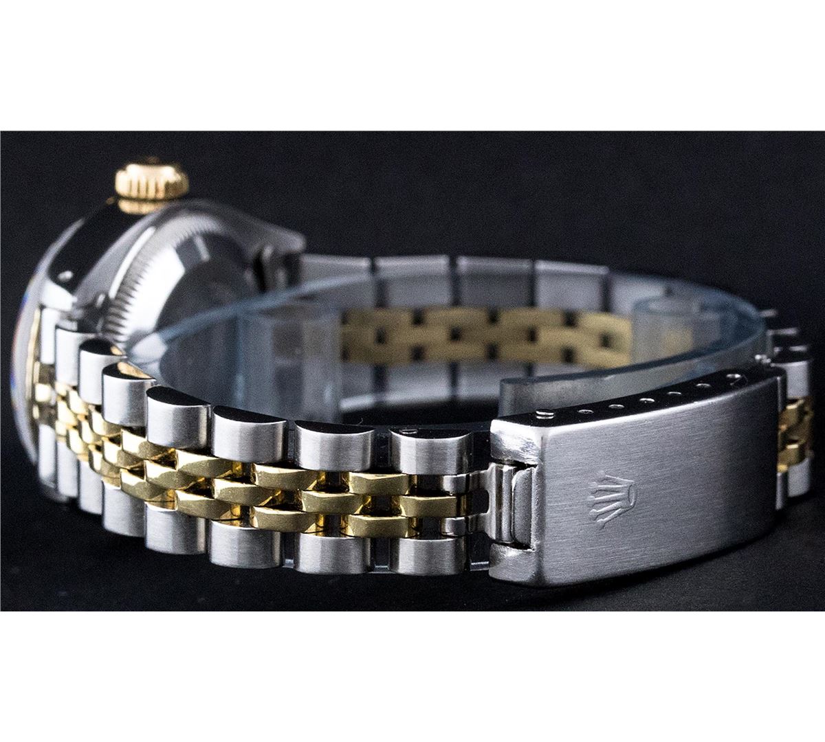 One Ladies Two Tone Rolex Datejust Polished, Serviced & Electronically Tested, 14K Yellow Gold & Stainless Steel Case:26mm, 14K Yellow Gold Crown, Bezel: 14K Yellow Gold Fluted Bezel. Custom Crystal: Acrylic Cyclops Lens. Movement: Automatic Winding Movement Caliber 2030. Custom Champagne Roman Dial. Date Window: 3 O'Clock Position Date Display, Non Quickset, Model: 6917 Condition: G-6 Extra Fine. Bracelet: Two Tone 14K Yellow Gold & Stainless Steel Jubilee. Bright Polish. 5.5 Inch Length, Adjustable. Standard Clasp, With Rolex Logo.