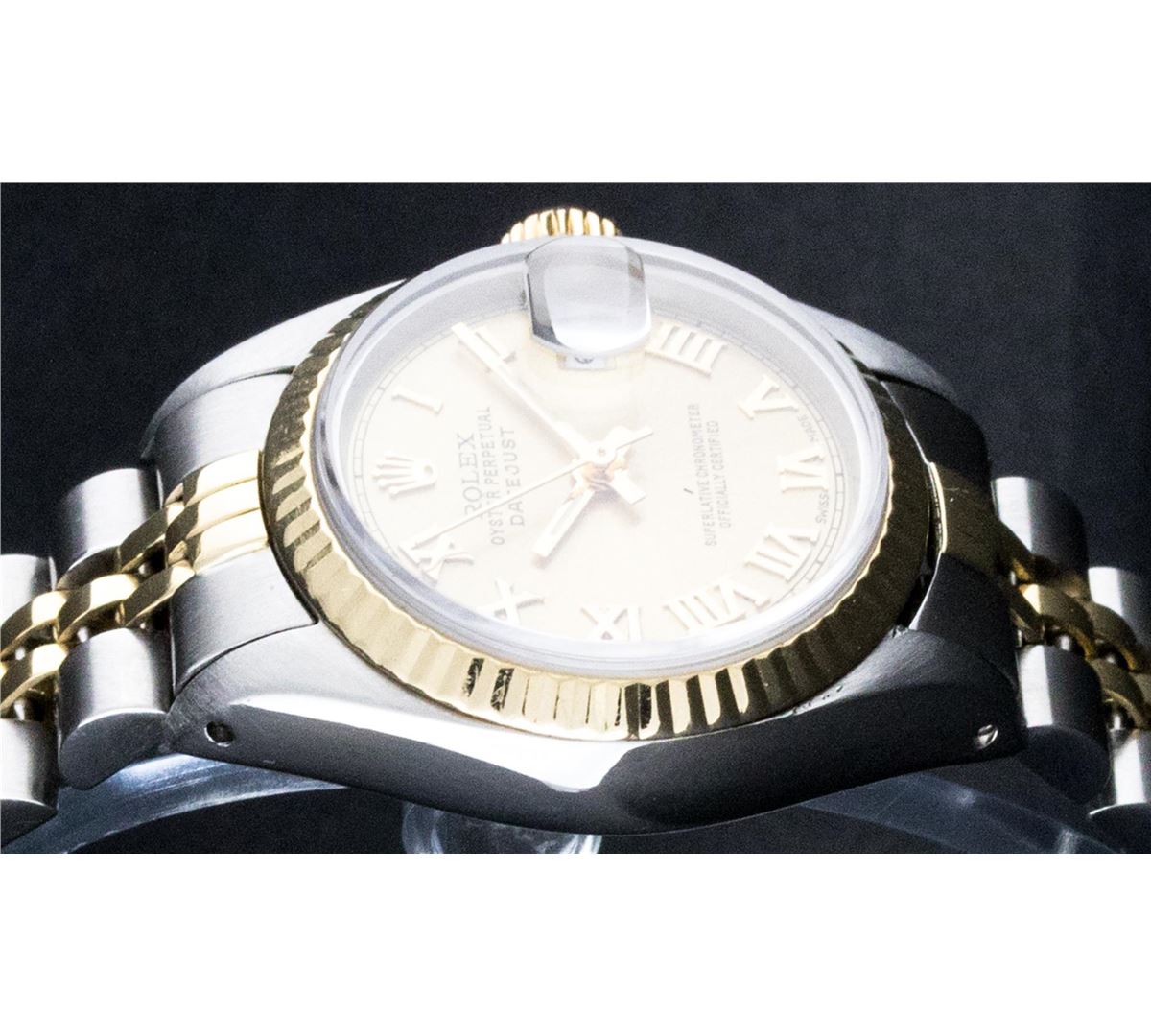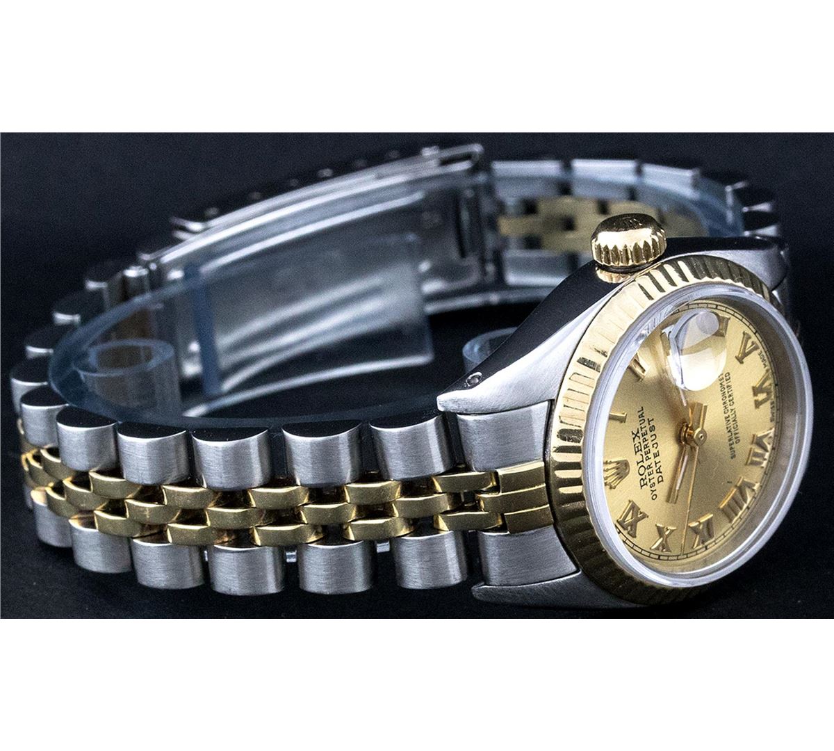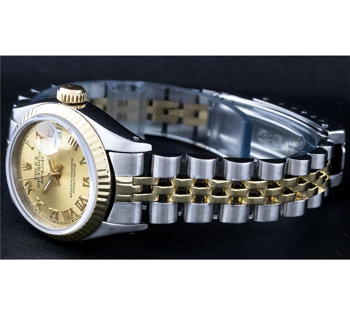 One Ladies Two Tone Rolex Datejust Polished, Serviced & Electronically Tested, 14K Yellow Gold & Stainless Steel Case:26mm, 14K Yellow Gold Crown, Bezel: 14K Yellow Gold Fluted Bezel. Custom Crystal: Acrylic Cyclops Lens. Movement: Automatic Winding Movement Caliber 2030. Custom Champagne Roman Dial. Date Window: 3 O'Clock Position Date Display, Non Quickset, Model: 6917 Condition: G-6 Extra Fine. Bracelet: Two Tone 14K Yellow Gold & Stainless Steel Jubilee. Bright Polish. 5.5 Inch Length, Adjustable. Standard Clasp, With Rolex Logo.