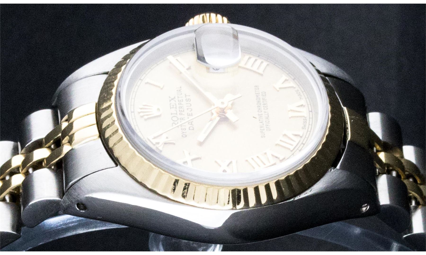 One Ladies Two Tone Rolex Datejust Polished, Serviced & Electronically Tested, 14K Yellow Gold & Stainless Steel Case:26mm, 14K Yellow Gold Crown, Bezel: 14K Yellow Gold Fluted Bezel. Custom Crystal: Acrylic Cyclops Lens. Movement: Automatic Winding Movement Caliber 2030. Custom Champagne Roman Dial. Date Window: 3 O'Clock Position Date Display, Non Quickset, Model: 6917 Condition: G-6 Extra Fine. Bracelet: Two Tone 14K Yellow Gold & Stainless Steel Jubilee. Bright Polish. 5.5 Inch Length, Adjustable. Standard Clasp, With Rolex Logo.