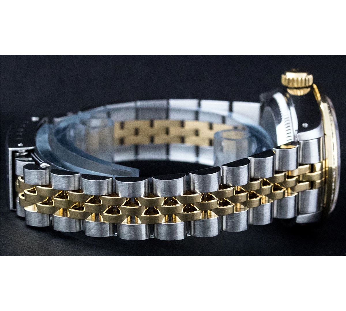 One Ladies Rolex Datejust Polished Bright with Satin Finish, Serviced & Electronically Tested, Stainless Steel Case:26mm, Yellow Gold Crown. Custom Bezel: 18K Yellow Gold Beadset Bezel, Diamond Count: 32 Diamonds, Total Weight 1.00 Carat, Clarity: SI-VS, Color: G to H. Custom Crystal: Synthetic Sapphire Cyclops Lens. Movement: Automatic Winding Movement Caliber 2030. Custom Dial: Refinished Champagne String Diamond Dial, Diamond Count: 43 Diamonds in Dial G To H In Color, Clarity: VVS. Date Window: 3 O'Clock Position Date Display, Non Quickset, Model: 6917 Condition: G-6 Extra Fine. Bracelet: Two Tone Yellow Gold and Stainless Steel Jubilee. Bright Polish & Satin Finish. 5.5 Inch Length, Adjustable. Standard Clasp, With Rolex Logo.
