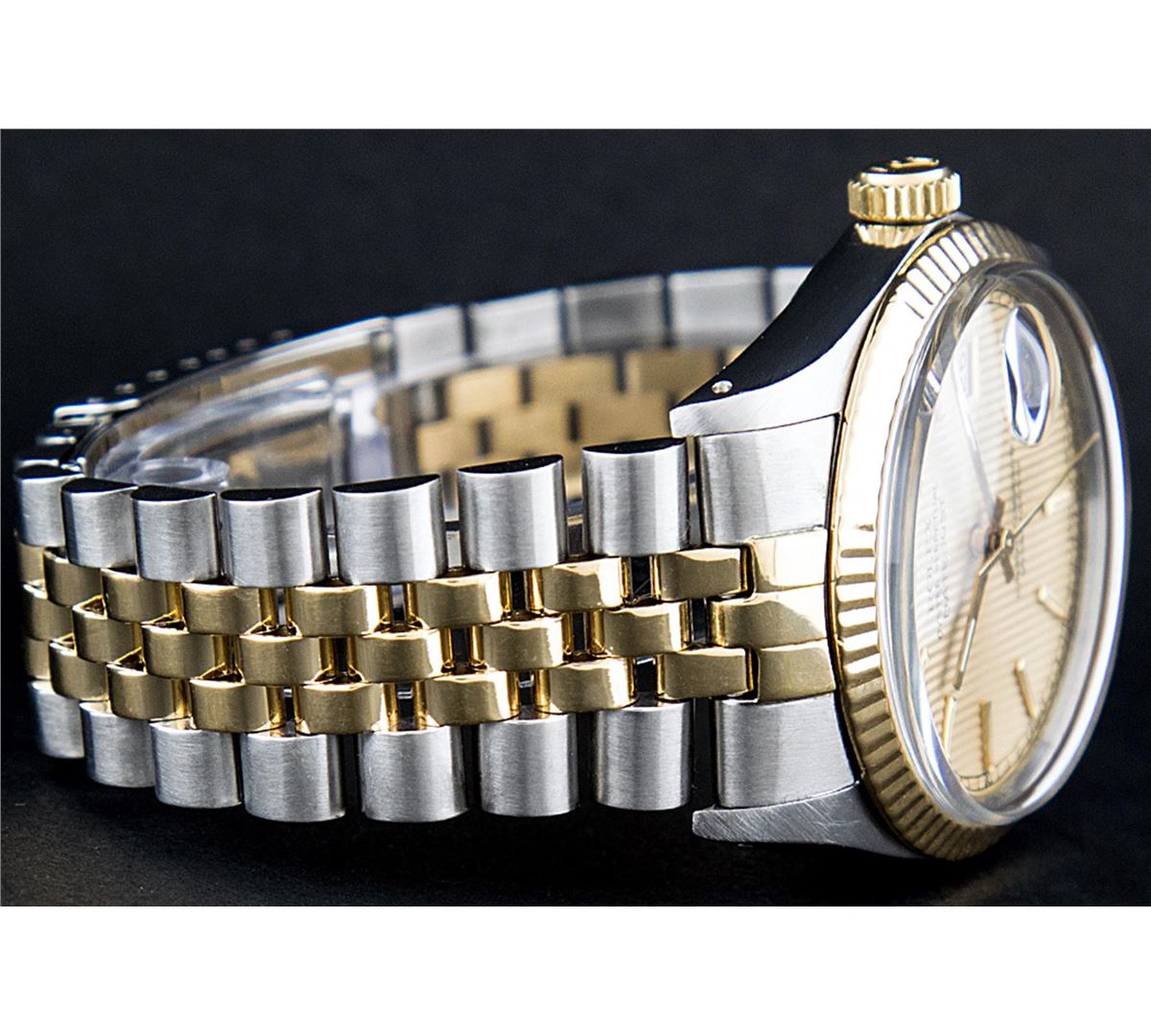 One Gents Two Tone Rolex Datejust Polished, Serviced & Electronically Tested, 14K Yellow Gold & Stainless Steel Case:36mm, 14K Yellow Gold Crown, Bezel: 14K Yellow Gold Fluted Bezel. Custom Crystal: Acrylic Cyclops Lens. Movement: Automatic Winding Movement Caliber 3035. Dial: Champagne Tapestry With Index Hour Markers & Square Roman Tracks. Date Window: 3 O'Clock Position Date Display, Quickset, Model: 16013 Condition: G-6 Extra Fine. Bracelet: Two Tone 14K Yellow Gold & Stainless Steel Jubilee. Bright Polish. 6.5 Inch Length, Adjustable. Standard Clasp, With Rolex Logo.