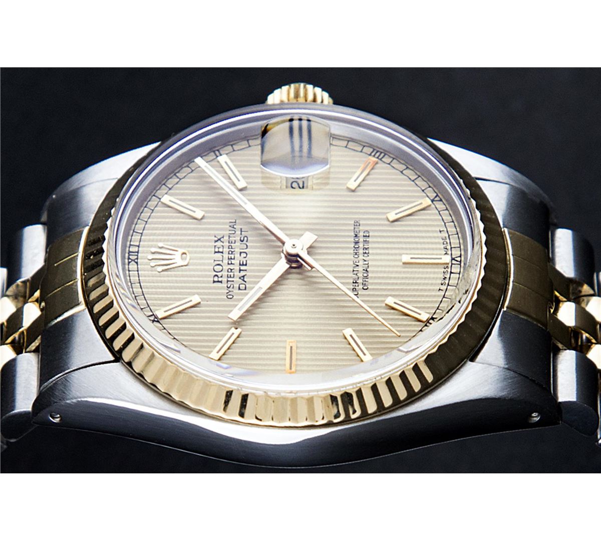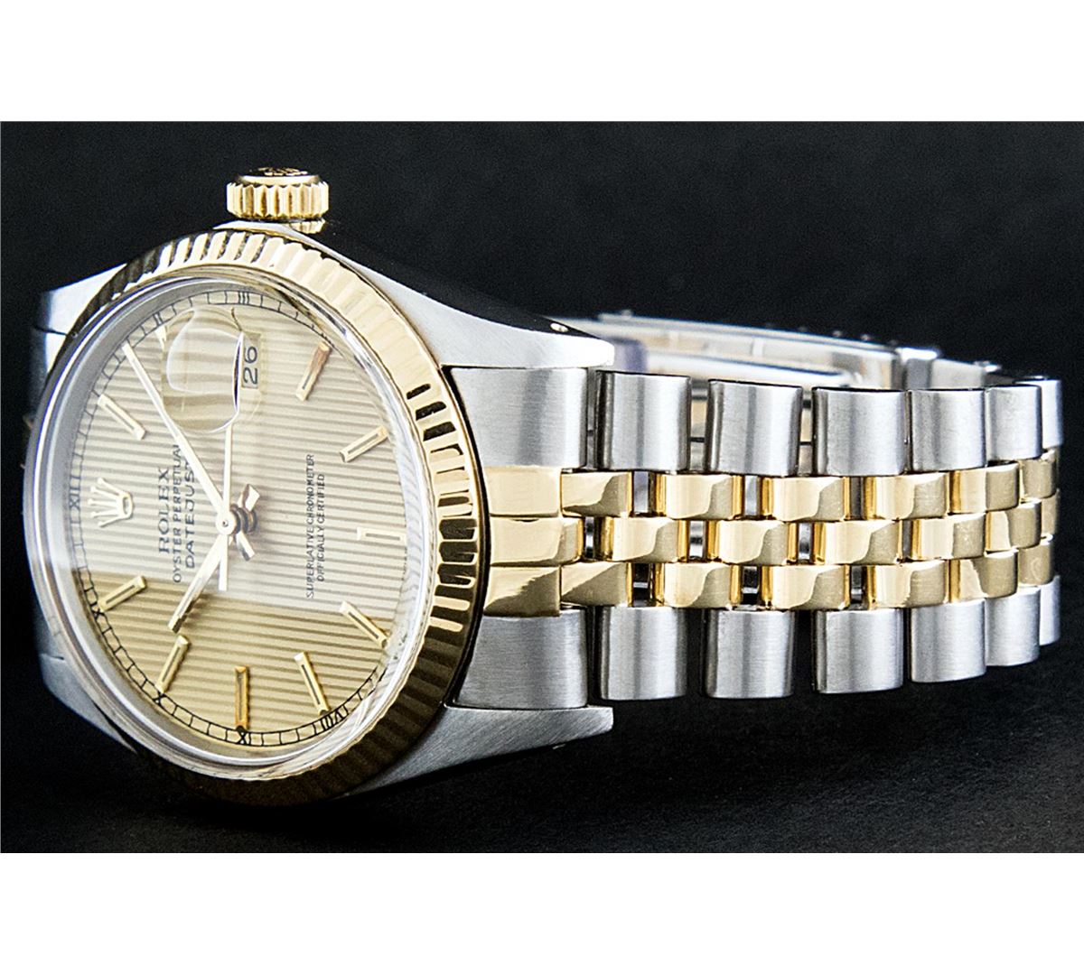 One Gents Two Tone Rolex Datejust Polished, Serviced & Electronically Tested, 14K Yellow Gold & Stainless Steel Case:36mm, 14K Yellow Gold Crown, Bezel: 14K Yellow Gold Fluted Bezel. Custom Crystal: Acrylic Cyclops Lens. Movement: Automatic Winding Movement Caliber 3035. Dial: Champagne Tapestry With Index Hour Markers & Square Roman Tracks. Date Window: 3 O'Clock Position Date Display, Quickset, Model: 16013 Condition: G-6 Extra Fine. Bracelet: Two Tone 14K Yellow Gold & Stainless Steel Jubilee. Bright Polish. 6.5 Inch Length, Adjustable. Standard Clasp, With Rolex Logo.