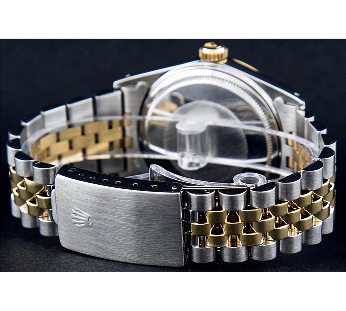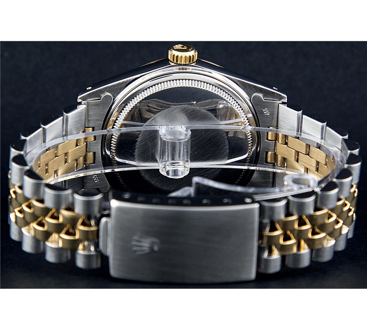 One Gents Two Tone Rolex Datejust Polished, Serviced & Electronically Tested, 14K Yellow Gold & Stainless Steel Case:36mm, 14K Yellow Gold Crown, Bezel: 14K Yellow Gold Fluted Bezel. Custom Crystal: Acrylic Cyclops Lens. Movement: Automatic Winding Movement Caliber 3035. Dial: Champagne Tapestry With Index Hour Markers & Square Roman Tracks. Date Window: 3 O'Clock Position Date Display, Quickset, Model: 16013 Condition: G-6 Extra Fine. Bracelet: Two Tone 14K Yellow Gold & Stainless Steel Jubilee. Bright Polish. 6.5 Inch Length, Adjustable. Standard Clasp, With Rolex Logo.