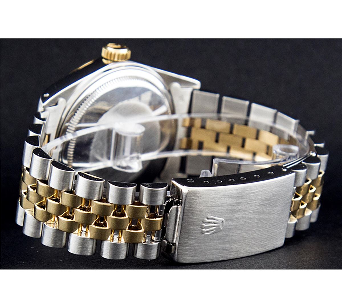 One Gents Two Tone Rolex Datejust Polished, Serviced & Electronically Tested, 14K Yellow Gold & Stainless Steel Case:36mm, 14K Yellow Gold Crown, Bezel: 14K Yellow Gold Fluted Bezel. Custom Crystal: Acrylic Cyclops Lens. Movement: Automatic Winding Movement Caliber 3035. Dial: Champagne Tapestry With Index Hour Markers & Square Roman Tracks. Date Window: 3 O'Clock Position Date Display, Quickset, Model: 16013 Condition: G-6 Extra Fine. Bracelet: Two Tone 14K Yellow Gold & Stainless Steel Jubilee. Bright Polish. 6.5 Inch Length, Adjustable. Standard Clasp, With Rolex Logo.
