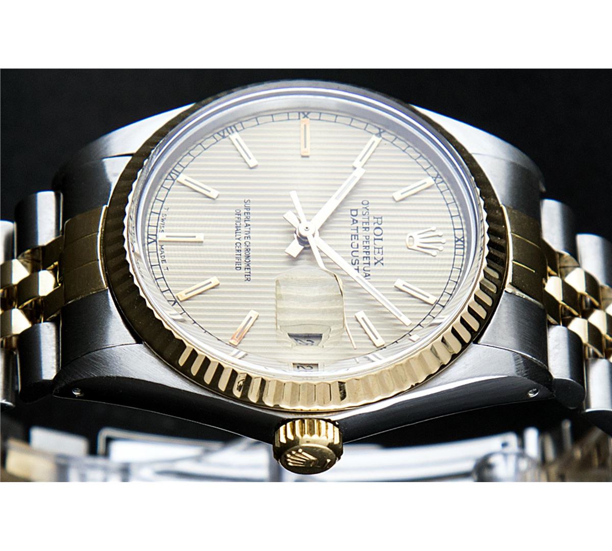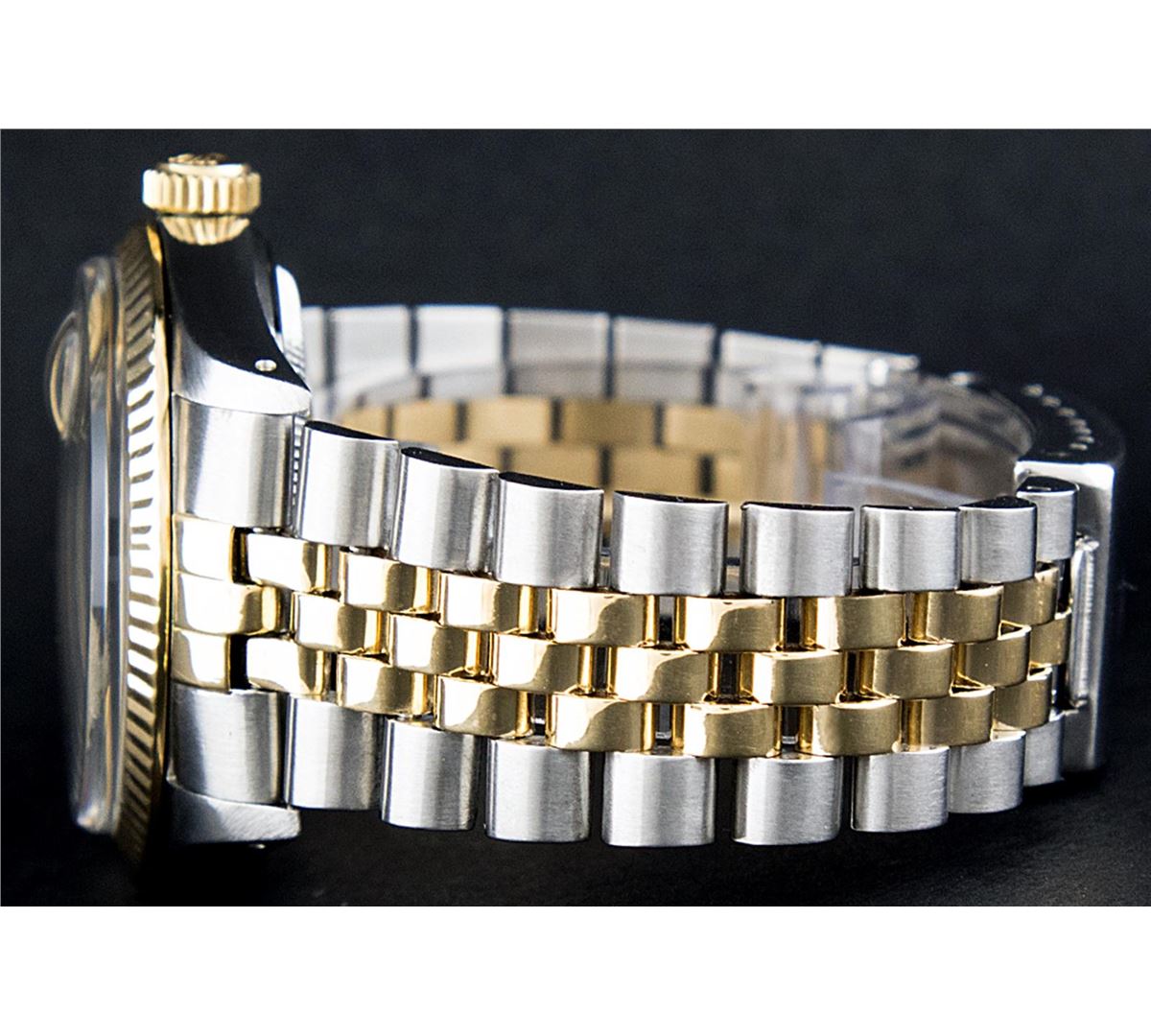 One Gents Two Tone Rolex Datejust Polished, Serviced & Electronically Tested, 14K Yellow Gold & Stainless Steel Case:36mm, 14K Yellow Gold Crown, Bezel: 14K Yellow Gold Fluted Bezel. Custom Crystal: Acrylic Cyclops Lens. Movement: Automatic Winding Movement Caliber 3035. Dial: Champagne Tapestry With Index Hour Markers & Square Roman Tracks. Date Window: 3 O'Clock Position Date Display, Quickset, Model: 16013 Condition: G-6 Extra Fine. Bracelet: Two Tone 14K Yellow Gold & Stainless Steel Jubilee. Bright Polish. 6.5 Inch Length, Adjustable. Standard Clasp, With Rolex Logo.