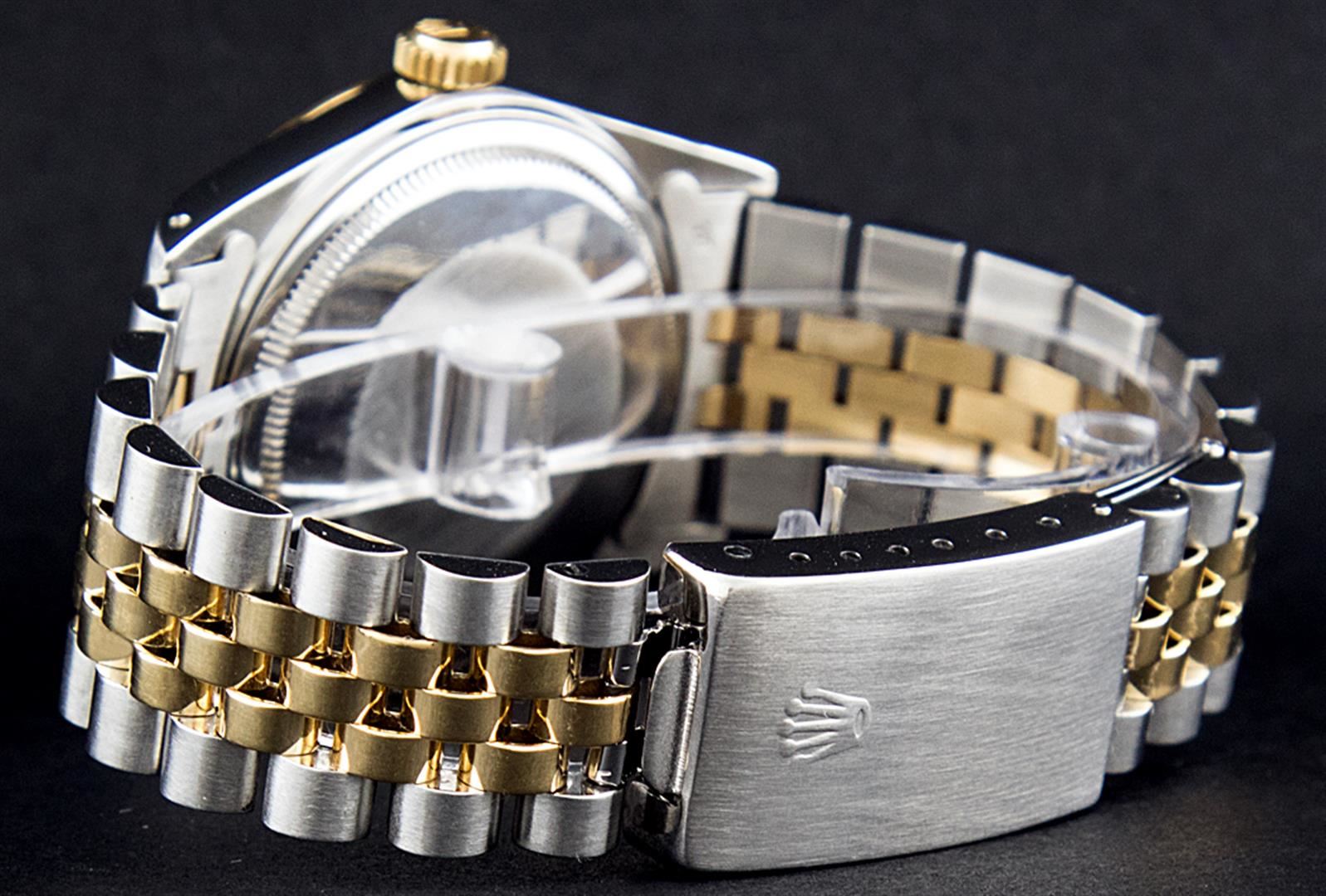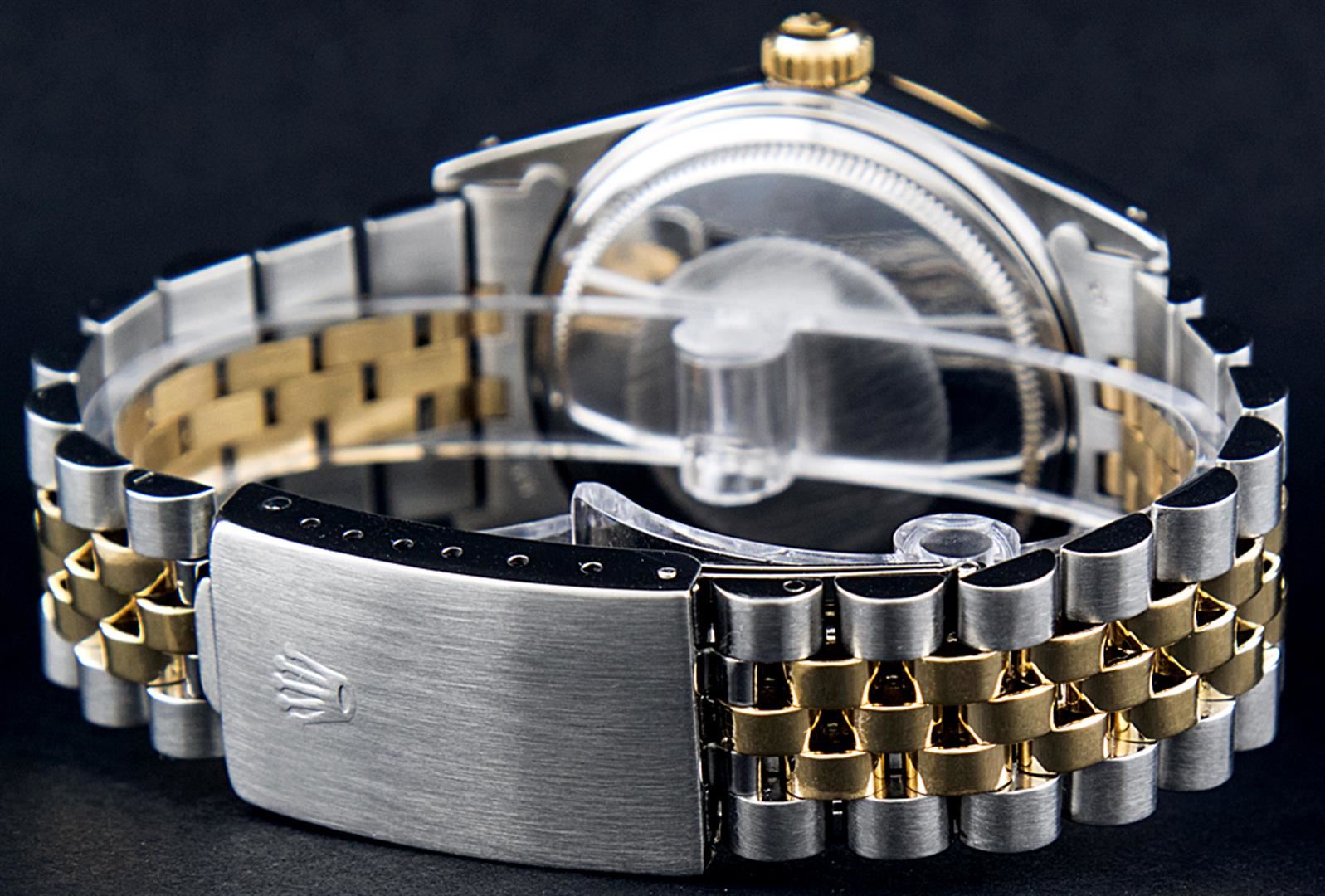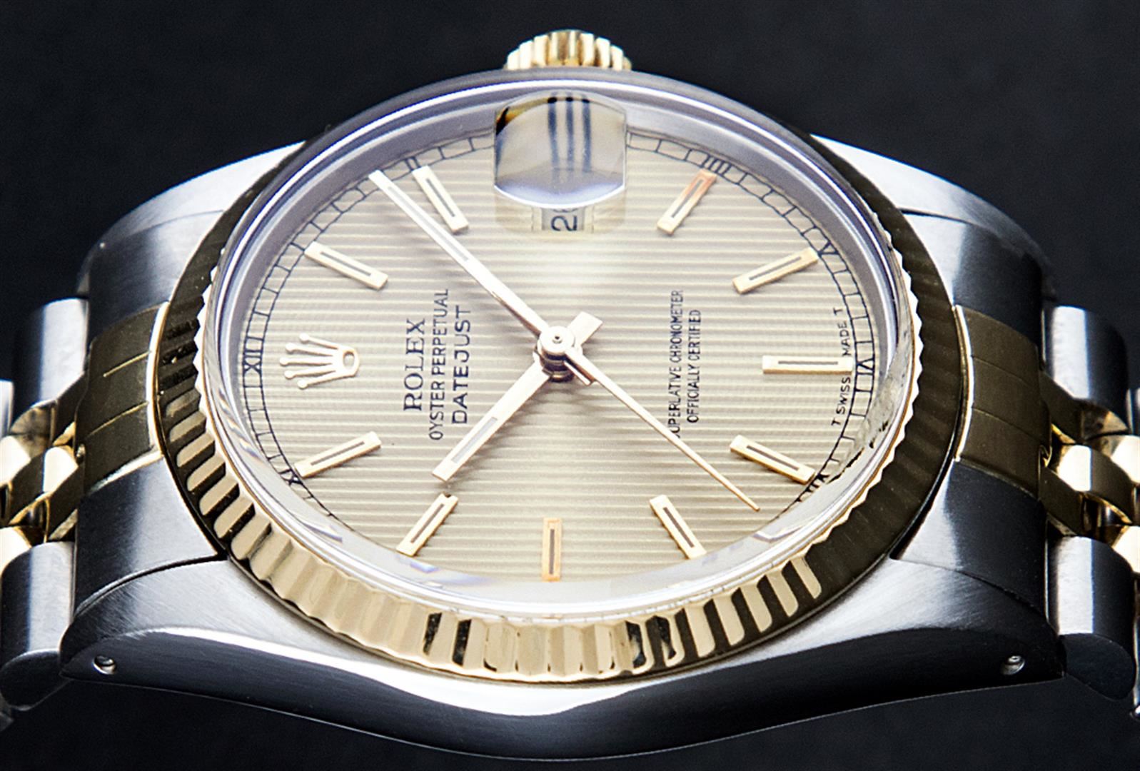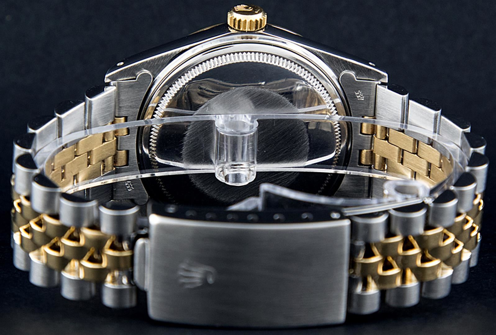 One Gents Two Tone Rolex Datejust Polished, Serviced & Electronically Tested, 14K Yellow Gold & Stainless Steel Case:36mm, 14K Yellow Gold Crown, Bezel: 14K Yellow Gold Fluted Bezel. Custom Crystal: Acrylic Cyclops Lens. Movement: Automatic Winding Movement Caliber 3035. Dial: Champagne Tapestry With Index Hour Markers & Square Roman Tracks. Date Window: 3 O'Clock Position Date Display, Quickset, Model: 16013 Condition: G-6 Extra Fine. Bracelet: Two Tone 14K Yellow Gold & Stainless Steel Jubilee. Bright Polish. 6.5 Inch Length, Adjustable. Standard Clasp, With Rolex Logo.