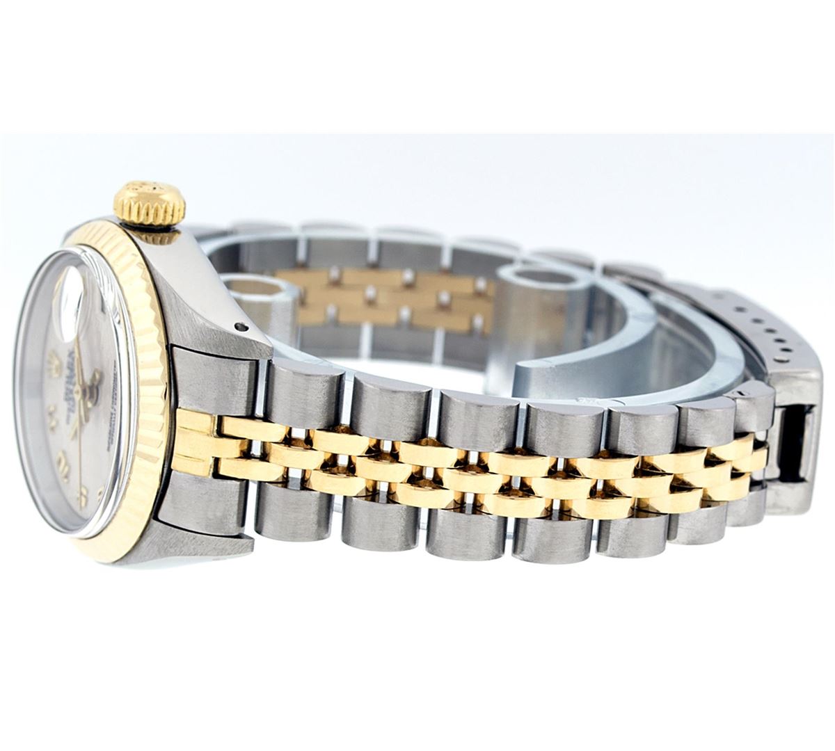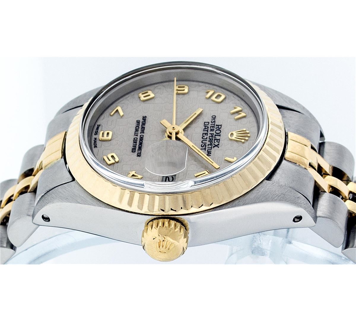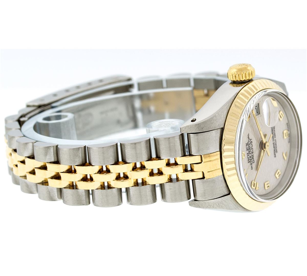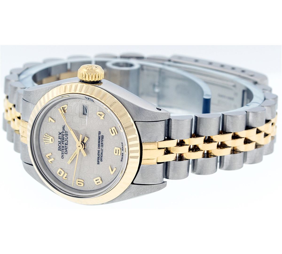 One Ladies Two Tone Rolex Datejust Polished, Serviced & Electronically Tested, 14K Yellow Gold & Stainless Steel Case:26mm, 14K Yellow Gold Crown, Bezel: 14K Yellow Gold Fluted Bezel. Custom Crystal: Acrylic Cyclops Lens. Movement: Automatic Winding Movement Caliber 2030. Custom Dial: Cream Arabic Jubilee Dial. Date Window: 3 O'Clock Position Date Display, Model: Datejust. Condition: G-6 Extra Fine. Bracelet: Two Tone 14K Yellow Gold & Stainless Steel Jubilee Band. Bright Polish. 6.0 Inch Length, Adjustable. Standard Clasp, With Rolex Logo.