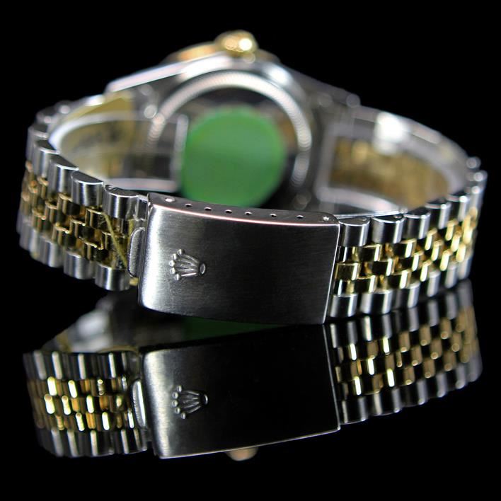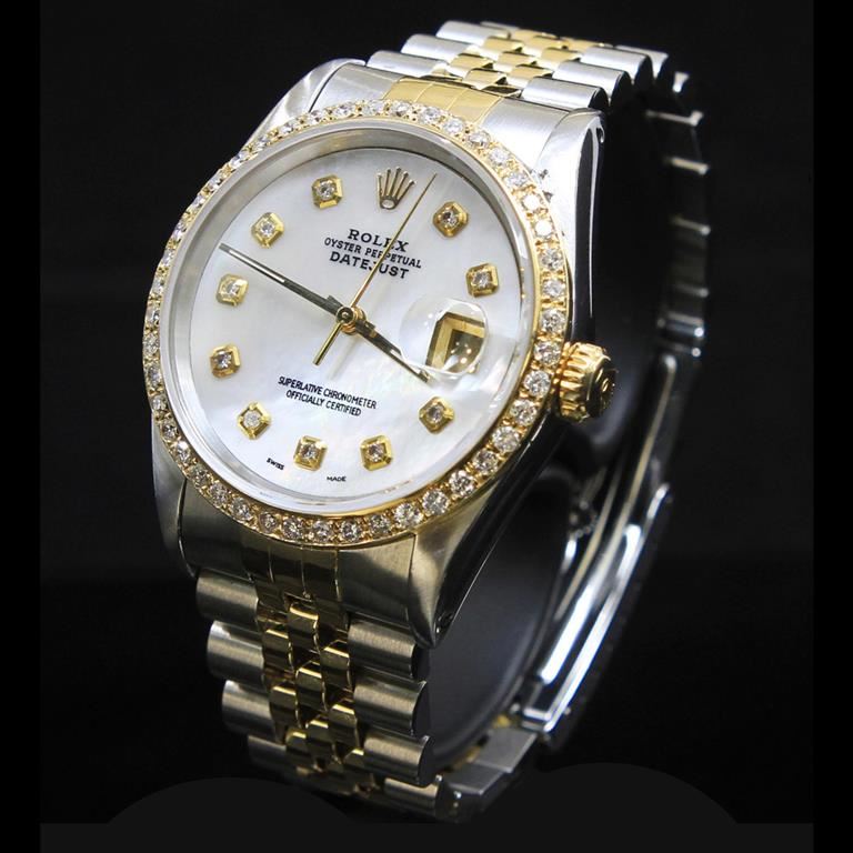 ****** Rolex Two-Tone DateJust 36mm Custom White MOP Dial Diamond Bezel Aprox. 1.65 cts. Diamond Dial Men's Wristwatch ****** One Mens, Rolex Two-Tone DateJust 36mm Custom White MOP Dial Diamond Bezel Aprox. 1.65 cts. Diamond Dial Wristwatch Stainless Steel & 18K Solid Yellow Gold electronically tested and polished / Case: Stainless Steel, 36mm / Dial: White Mother Of Pearl / Bezel: Diamonds / Bracelet: Stainless Steel and 18K Solid Yellow Gold. Standard clasp, with logo / Condition: Pre-Owned / Good Condition /
