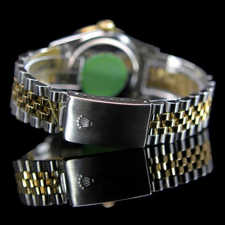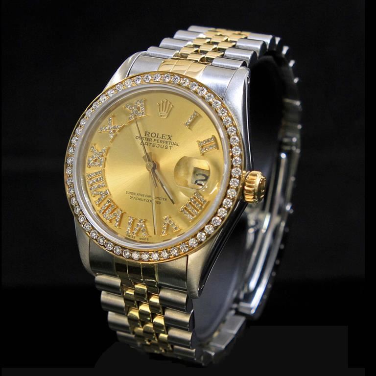 ****** Rolex Two-Tone DateJust 36mm Champagne Custom Roman Numerals Diamond Bezel Aprox. 2.0 cts. Diamond Dial Men's Wristwatch ****** One Mens, Rolex Two-Tone DateJust 36mm Champagne Custom Roman Numerals Diamond Bezel Aprox. 2.0 cts. Diamond Dial Wristwatch Stainless Steel & 18K Solid Yellow Gold electronically tested and polished / Case: Stainless Steel, 36mm / Dial: Champagne Custom Roman Numerals / Bezel: Diamonds (aprox.) 2.0cts / Bracelet: Stainless Steel and 18K Solid Yellow Gold. Standard clasp, with logo / Condition: Pre-Owned / Good Condition /