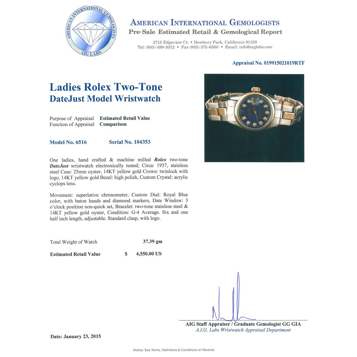 One ladies, hand crafted & machine milled Rolex two-tone DateJust wristwatch electronically tested; Circa: 1937, stainless steel Case: 25mm oyster, 14KT yellow gold Crown: twinlock with logo, 14KT yellow gold Bezel: high polish, Custom Crystal: acrylic cyclops lens. Movement: superlative chronometer, Custom Dial: Royal Blue color, with baton hands and diamond markers, Date Window: 3 o'clock position non-quick set, Bracelet: two-tone stainless steel & 14KT yellow gold oyster, Condition: G-4 Average. Six and one half inch length, adjustable. Standard clasp, with logo. Total Weight of Watch 37.39 grams. AIG Appraised at $4,550.00.