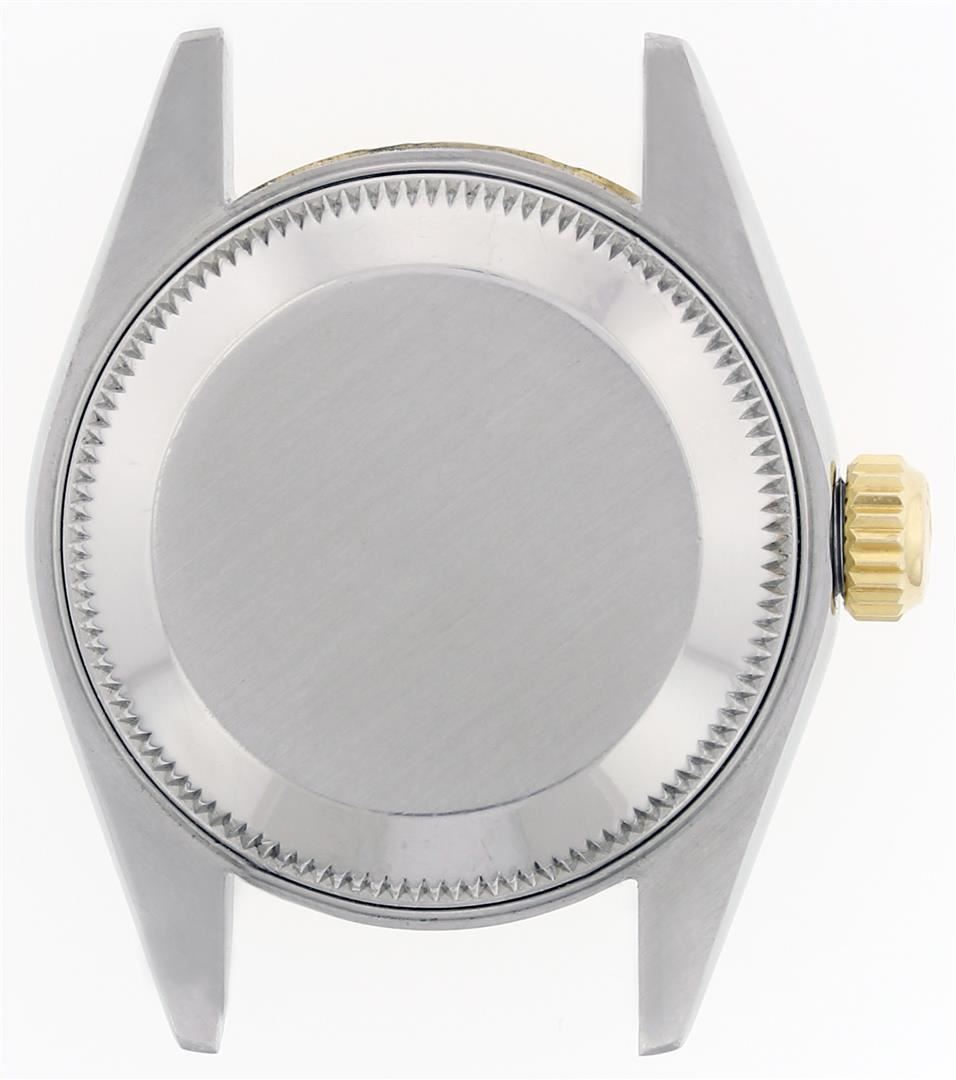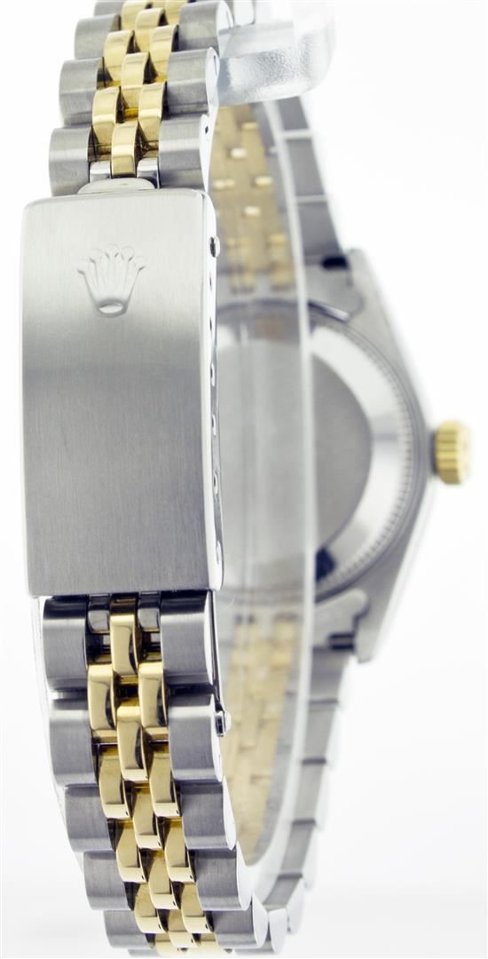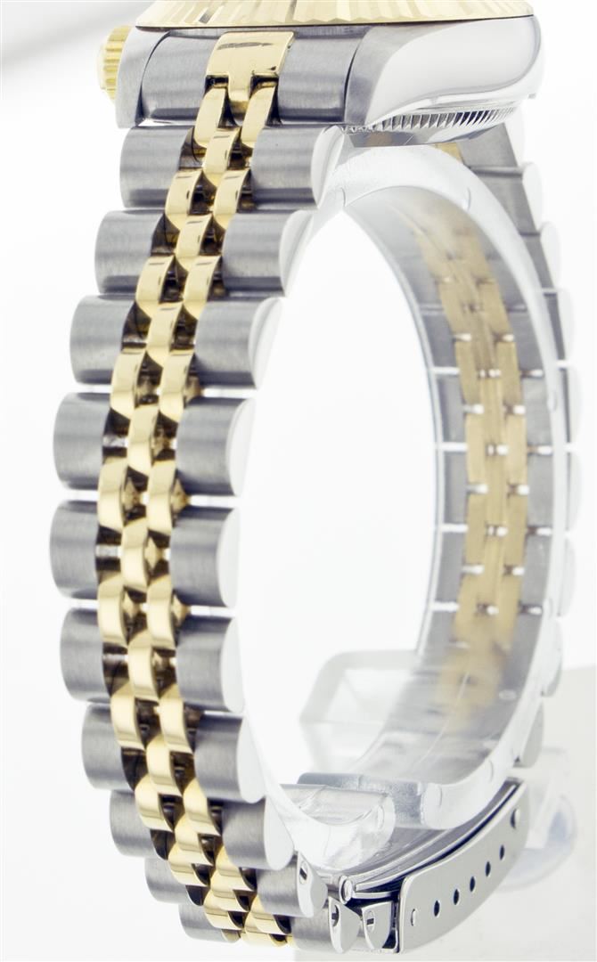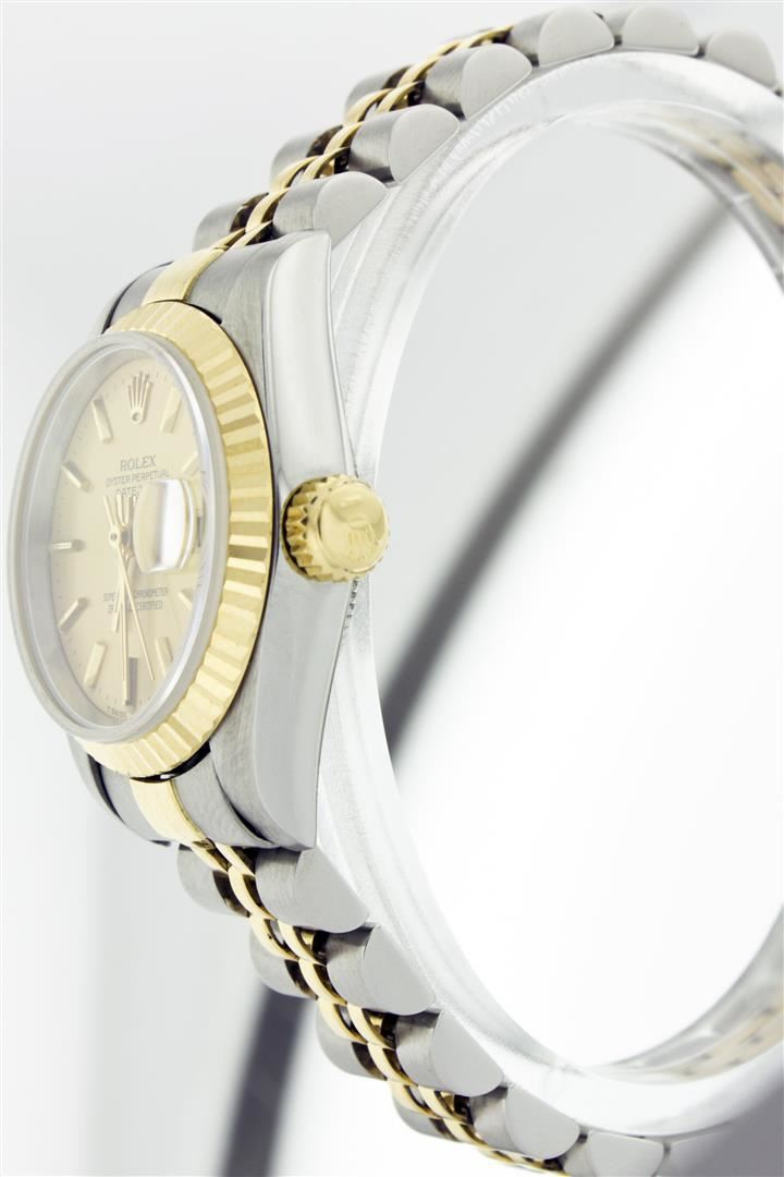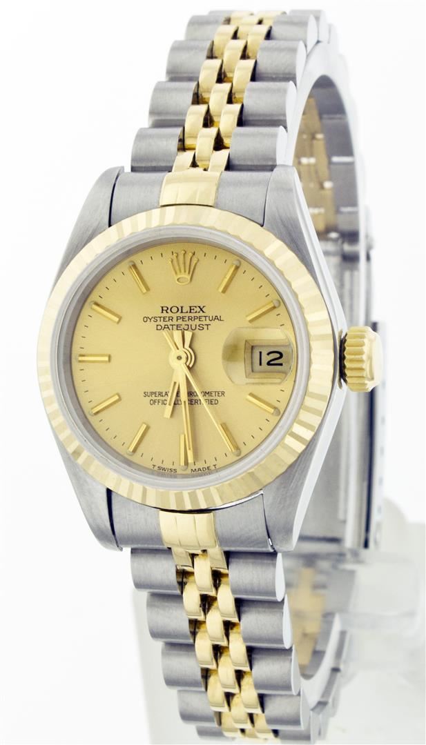 One Ladies Two Tone Rolex Datejust Polished, Serviced & Electronically Tested, 14K Yellow Gold & Stainless Steel Case:26mm, 14K Yellow Gold Crown, Bezel: 14K Yellow Gold Fluted Bezel. Custom Crystal: Synthetic Sapphire Cyclops Lens. Movement: Automatic Winding Movement Caliber 2030. Custom Dial: Champagne With Index Hour Markers. Window: 3 O'Clock Position Date Display, Non Quickset, Model: 6917 Condition: G-6 Extra Fine. Bracelet: Two Tone 14K Yellow Gold & Stainless Steel Jubilee. Bright Polish. 5.5 Inch Length, Adjustable. Standard Clasp, With Rolex Logo.