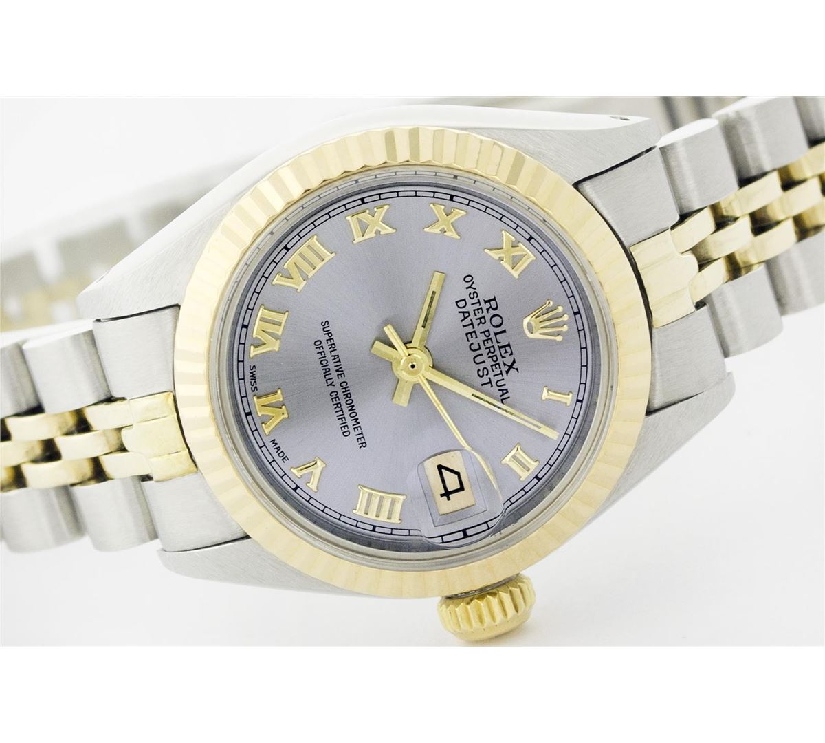 One Ladies Two Tone Rolex Datejust Polished, Serviced & Electronically Tested, 14K Yellow Gold & Stainless Steel Case:26mm, 14K Yellow Gold Crown, Bezel: 14K Yellow Gold Fluted Bezel. Custom Crystal: Synthetic Sapphire Cyclops Lens. Movement: Automatic Winding Movement Caliber 2030. Custom Dial: Slate Grey With Roman Hour Markers. Date Window: 3 O'Clock Position Date Display, Non Quickset, Model: 6917 Condition: G-6 Extra Fine. Bracelet: Two Tone 14K Yellow Gold & Stainless Steel Jubilee. Bright Polish. 5.5 Inch Length, Adjustable. Standard Clasp, With Rolex Logo.