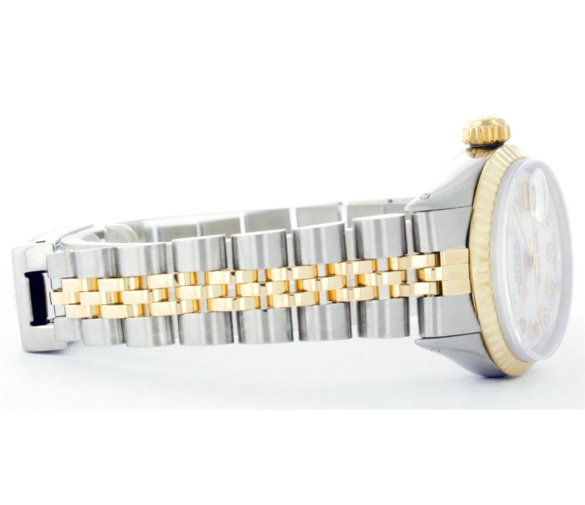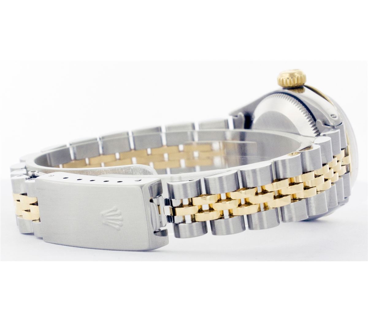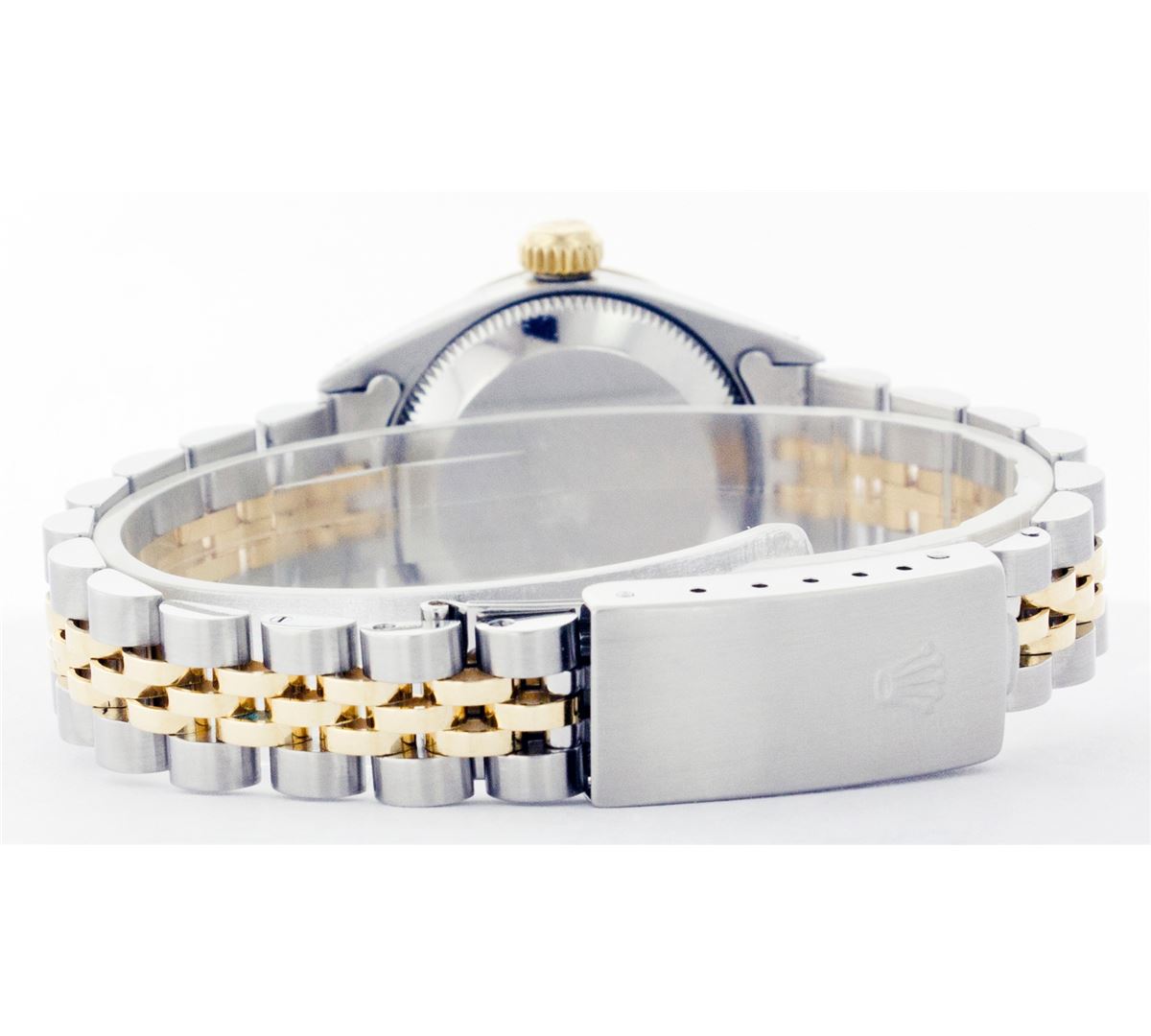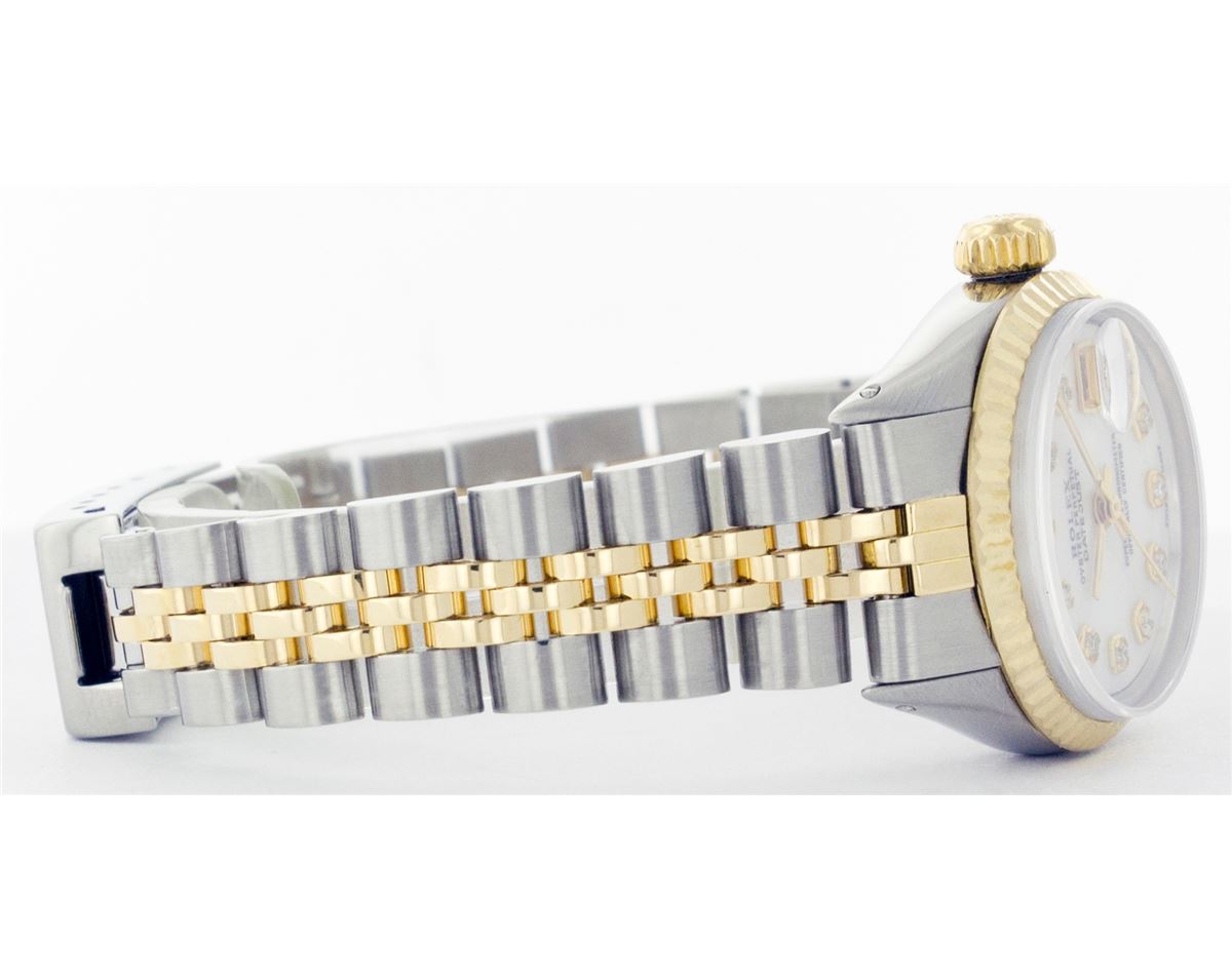 One Ladies Two Tone Rolex Datejust Polished, Serviced & Electronically Tested, 14K Yellow Gold & Stainless Steel Case:26mm, 14K Yellow Gold Crown, Bezel: 14K Yellow Gold Fluted Bezel. Custom Crystal: Synthetic Sapphire Cyclops Lens. Movement: Automatic Winding Movement Caliber 2030. Custom Dial: Mother Of Pearl With Diamond Hour Markers, Diamond Count: 10 Diamonds, Color: G to H, Clarity: VS2-SI1. Date Window: 3 O'Clock Position Date Display, Non Quickset, Model: 6917 Condition: G-6 Extra Fine. Bracelet: Two Tone 14K Yellow Gold & Stainless Steel Jubilee. Bright Polish. 5.5 Inch Length, Adjustable. Standard Clasp, With Rolex Logo.