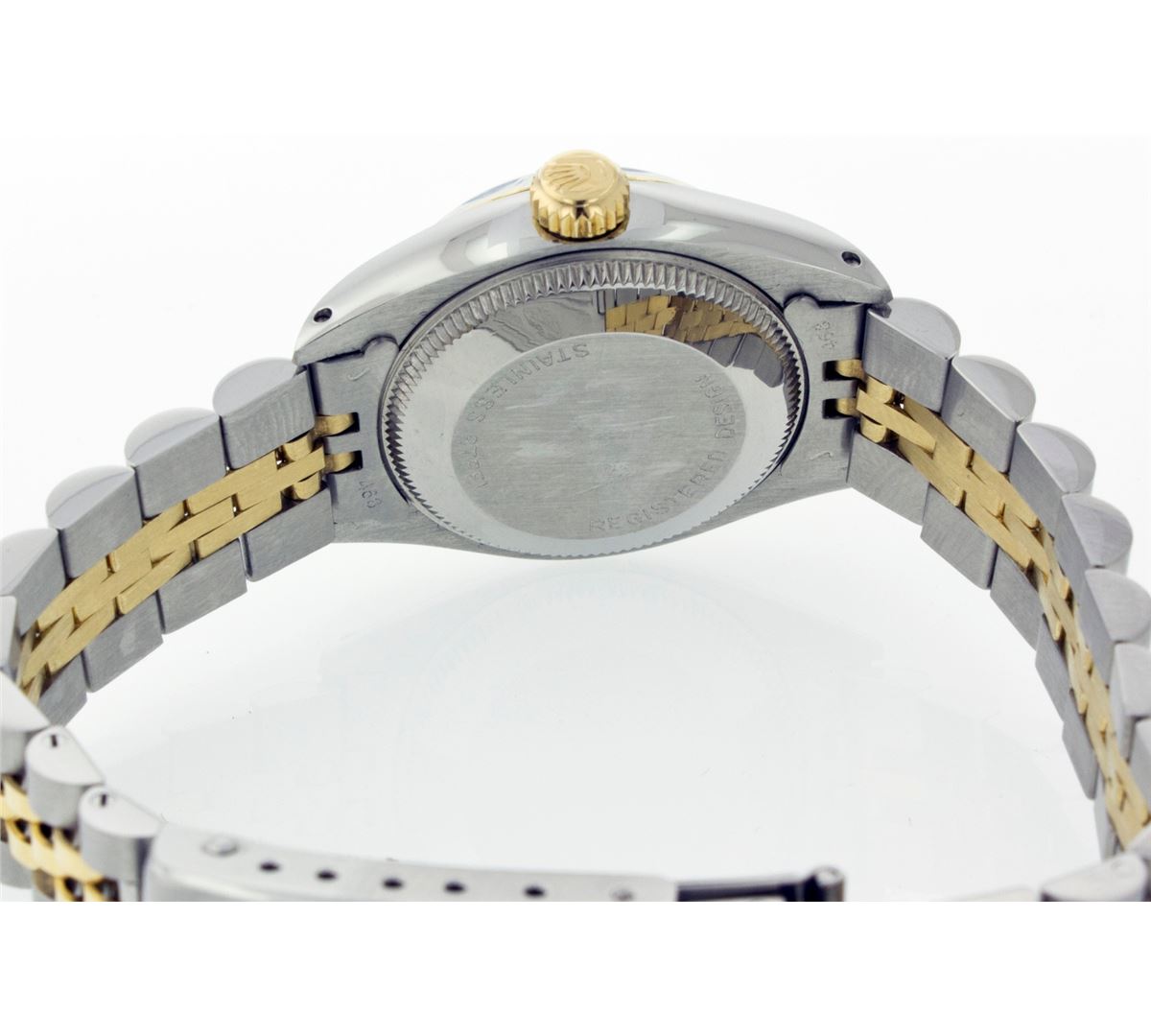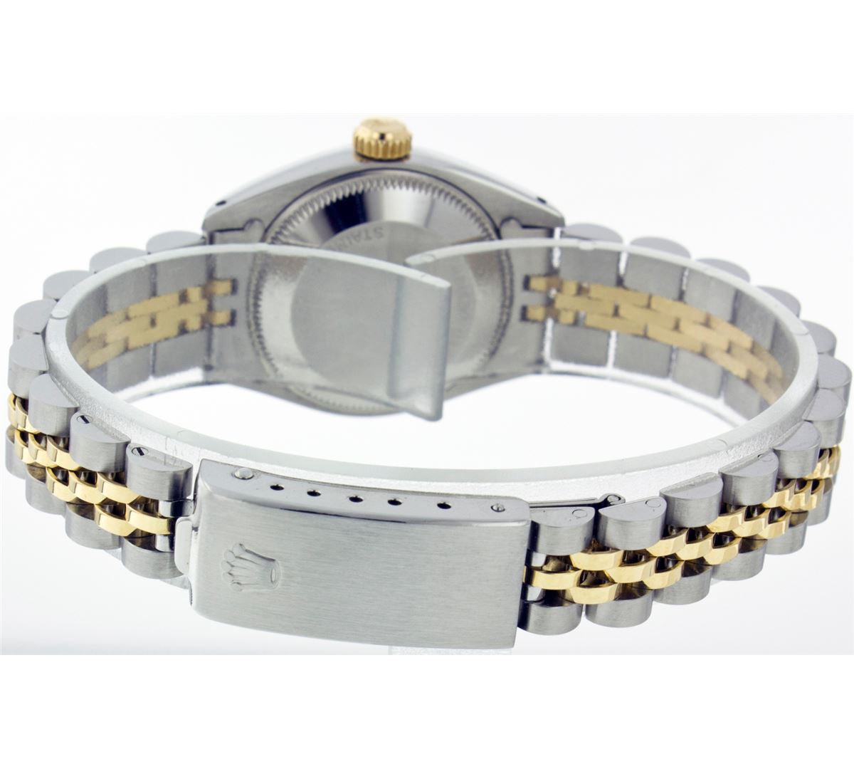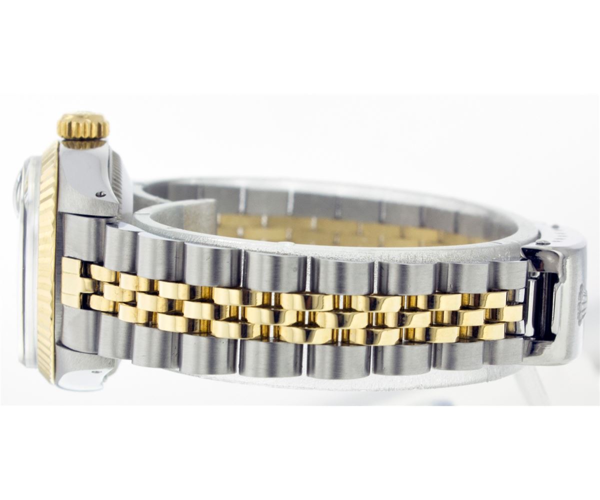 One Ladies Two Tone Rolex Datejust Polished, Serviced & Electronically Tested, 14K Yellow Gold & Stainless Steel Case:26mm, 14K Yellow Gold Crown, Custom Bezel: 14K Yellow Gold Fluted Bezel. Custom Crystal: Synthetic Sapphire Cyclops Lens. Movement: Automatic Winding Movement Caliber 2030. Custom Dial: Champagne with Diamond Hour Markers. 10 Diamonds In Dial, Clarity: Si-VS, Color: G to H. Date Window: 3 O'Clock Position Date Display, Non Quickset, Model: 6917 Condition: G-6 Extra Fine. Bracelet: Two Tone 14K Yellow Gold & Stainless Steel Jubilee. Bright Polish. 5.5 Inch Length, Adjustable. Standard Clasp, With Rolex Logo.