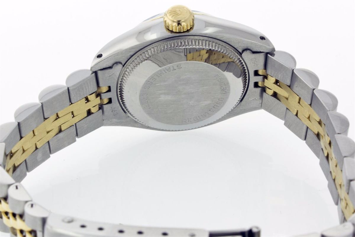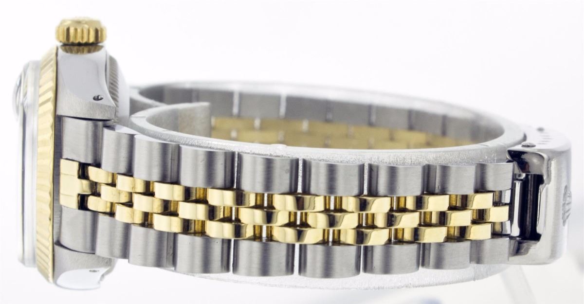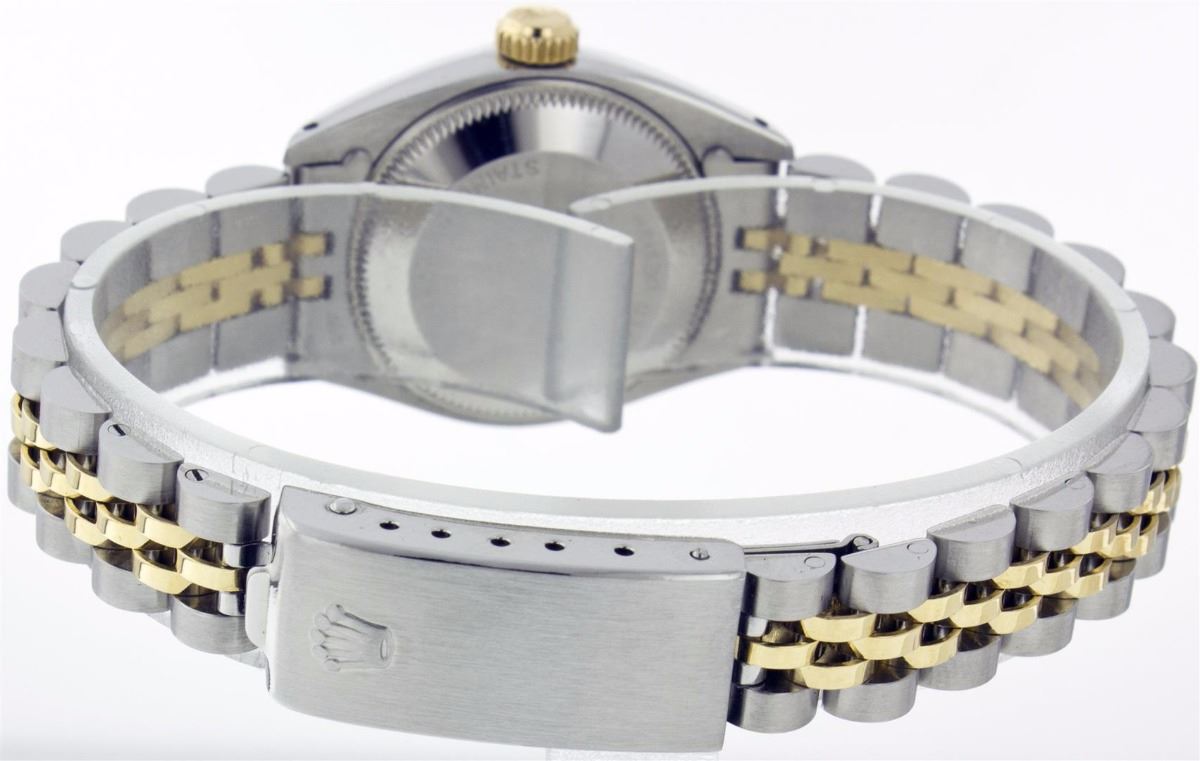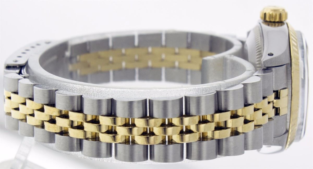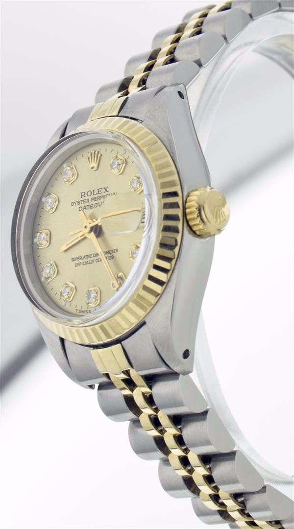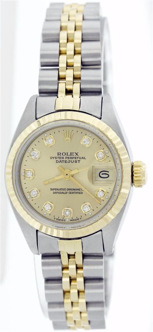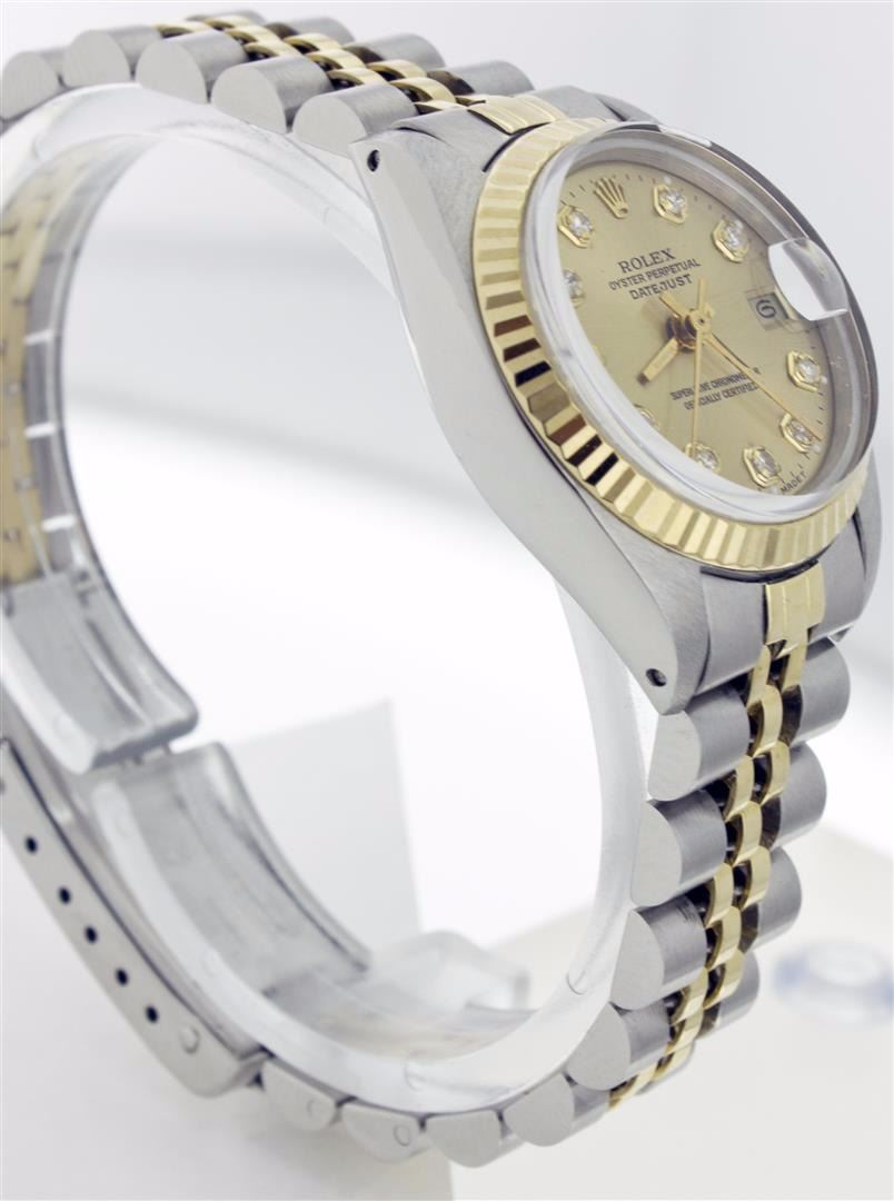 One Ladies Two Tone Rolex Datejust Polished, Serviced & Electronically Tested, 14K Yellow Gold & Stainless Steel Case:26mm, 14K Yellow Gold Crown, Custom Bezel: 14K Yellow Gold Fluted Bezel. Custom Crystal: Synthetic Sapphire Cyclops Lens. Movement: Automatic Winding Movement Caliber 2030. Custom Dial: Champagne with Diamond Hour Markers. 10 Diamonds In Dial, Clarity: Si-VS, Color: G to H. Date Window: 3 O'Clock Position Date Display, Non Quickset, Model: 6917 Condition: G-6 Extra Fine. Bracelet: Two Tone 14K Yellow Gold & Stainless Steel Jubilee. Bright Polish. 5.5 Inch Length, Adjustable. Standard Clasp, With Rolex Logo.