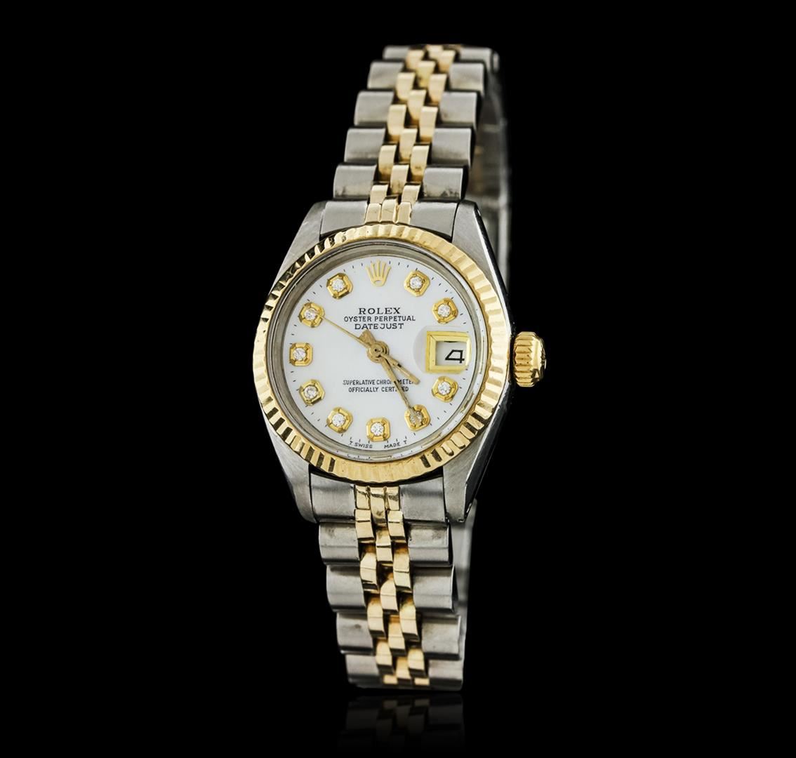 One ladies, hand crafted & machine milled Rolex DateJust Model wristwatch electronically tested, Stainless Steel Case: 26mm oyster, 14KT yellow gold Crown: twinlock with logo, 14KT yellow gold Bezel: fluted, Crystal: acrylic clops lens. Movement: superlative chronometer. Custom Dial: mother of pearl, with baton hands, and diamond markers, Date Window: 3 o'clock position date display, non-quick set, Circa: 1979, Condition: G-4 Average. Bracelet: stainless steel and 14KT yellow gold jubilee. Bright polish & brushed finish. Seven inch length, adjustable. Standard clasp, with logo. Total Weight of Watch 51.14 grams. AIG Appraised at $6,770.00.