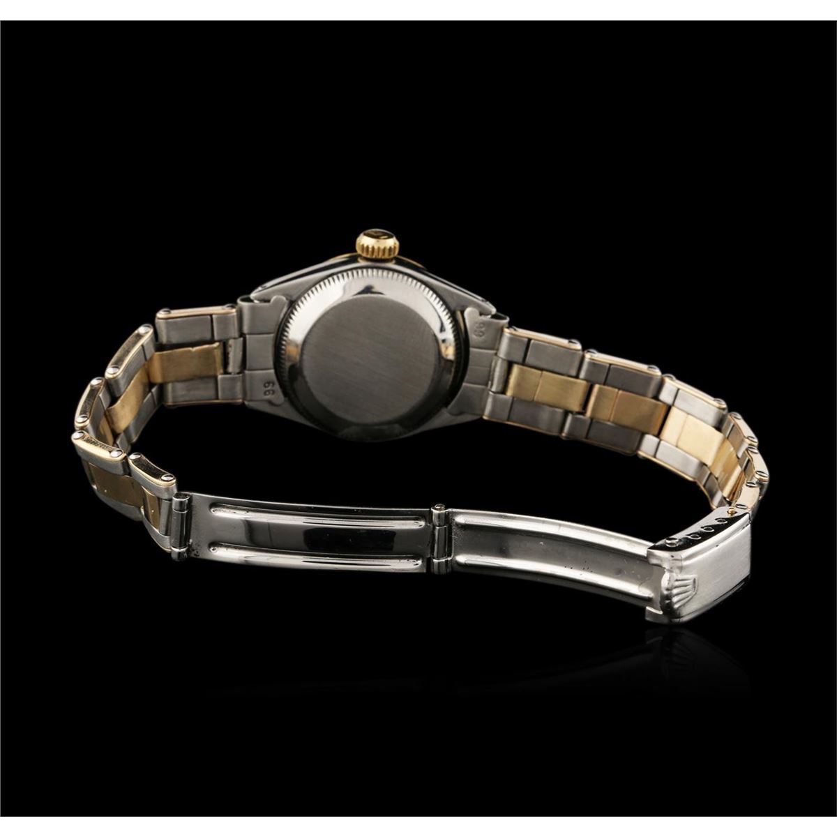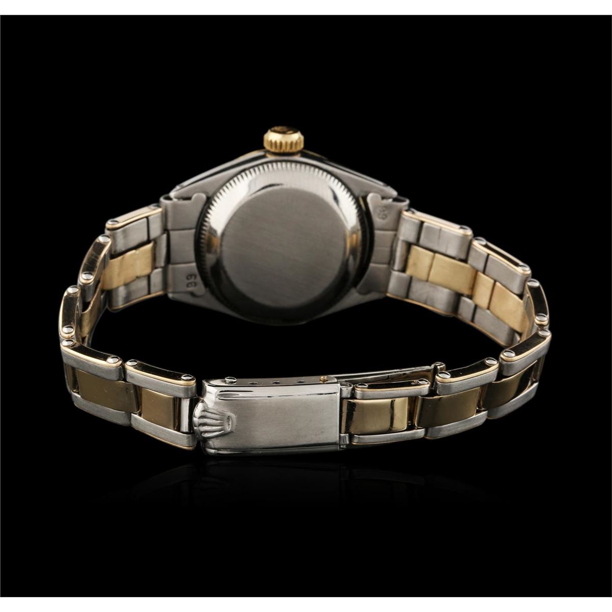 One ladies, hand crafted & machine milled Rolex two-tone DateJust wristwatch electronically tested; Circa: 1937, stainless steel Case: 25mm oyster, 14KT yellow gold Crown: twinlock with logo, 14KT yellow gold Bezel: high polish, Custom Crystal: acrylic cyclops lens. Movement: superlative chronometer, Custom Dial: Royal Blue color, with baton hands and diamond markers, Date Window: 3 o'clock position non-quick set, Bracelet: two-tone stainless steel & 14KT yellow gold oyster, Condition: G-4 Average. Six and one half inch length, adjustable. Standard clasp, with logo. Total Weight of Watch 37.39 grams. AIG Appraised at $4,550.00.