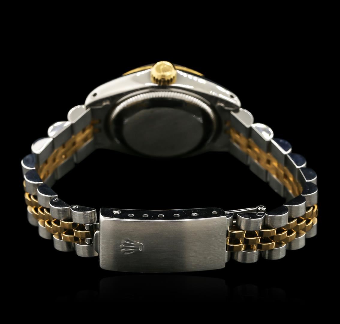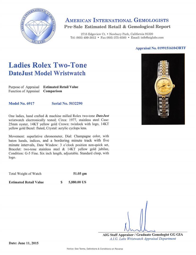 One ladies, hand crafted & machine milled Rolex two-tone DateJust wristwatch electronically tested; Circa: 1977, stainless steel Case: 25mm oyster, 14KT yellow gold Crown: twinlock with logo, 14KT yellow gold Bezel: fluted, Crystal: acrylic cyclops lens. Movement: superlative chronometer, Dial: Champagne color, with baton hands, indices, and a bordering minute track with five minute intervals, Date Window: 3 o'clock position non-quick set, Bracelet: two-tone stainless steel & 14KT yellow gold jubilee, Condition: G-5 Fine. Six inch length, adjustable. Standard clasp, with logo. Total Weight of Watch: 51.05 grams. Includes Rolex box. AIG Appraised at $5,880.00.