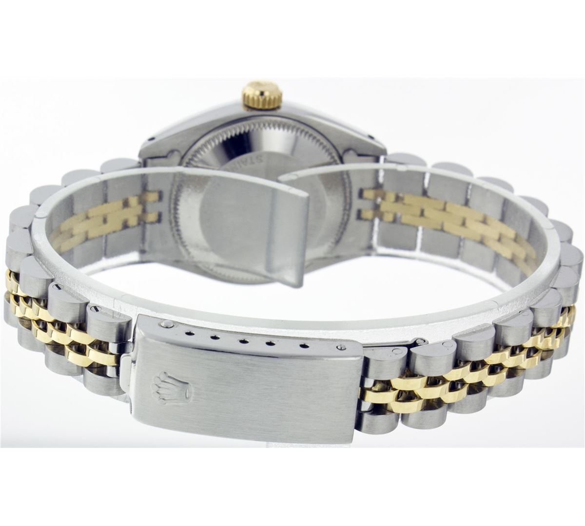 One Ladies Two Tone Rolex Datejust Polished, Serviced & Electronically Tested, 14K Yellow Gold & Stainless Steel Case:26mm, 14K Yellow Gold Crown, Bezel: 14K Yellow Gold Fluted Bezel. Custom Crystal: Acrylic Cyclops Lens. Movement: Automatic Winding Movement Caliber 2030. Custom Dial: Champagne with Diamond Hour Markers. 10 Diamonds In Dial, Clarity: Si-VS, Color: G to H. Date Window: 3 O'Clock Position Date Display, Non Quickset, Model: 6917 Condition: G-6 Extra Fine. Bracelet: Two Tone 14K Yellow Gold & Stainless Steel Jubilee. Bright Polish. 5.5 Inch Length, Adjustable. Standard Clasp, With Rolex Logo.