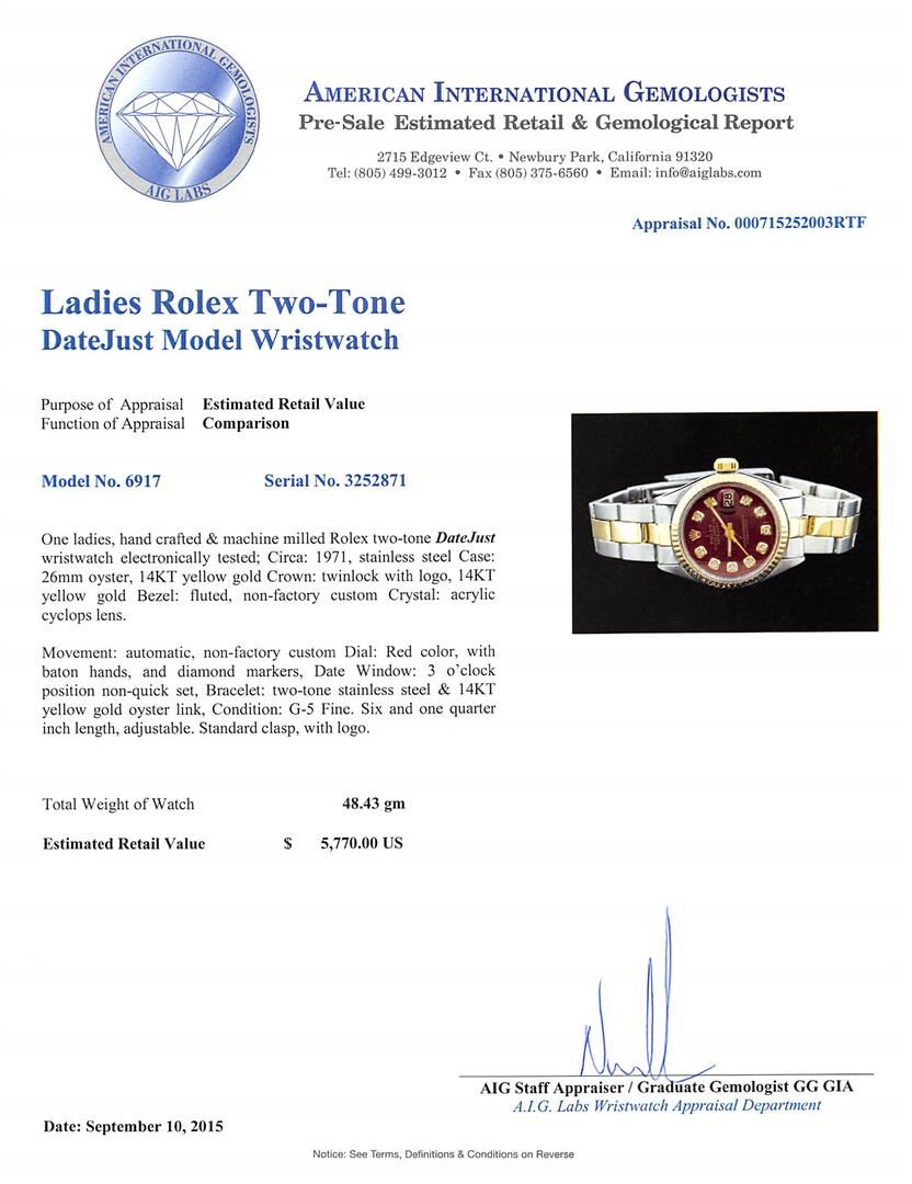One ladies, hand crafted & machine milled Rolex two-tone DateJust wristwatch electronically tested; Circa: 1971, stainless steel Case: 26mm oyster, 14KT yellow gold Crown: twinlock with logo, 14KT yellow gold Bezel: fluted, non-factory custom Crystal: acrylic cyclops lens. Movement: automatic, non-factory custom Dial: Red color, with baton hands, and diamond markers, Date Window: 3 o'clock position non-quick set, Bracelet: two-tone stainless steel & 14KT yellow gold oyster link, Condition: G-5 Fine. Six and one quarter inch length, adjustable. Standard clasp, with logo. Total Weight of Watch 48.43gm. AIG Appraised at $5,770.00.