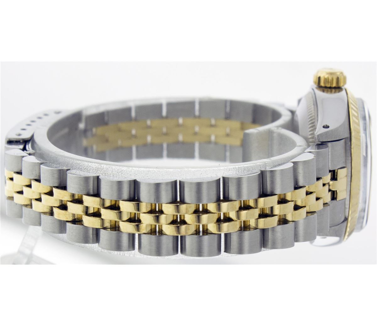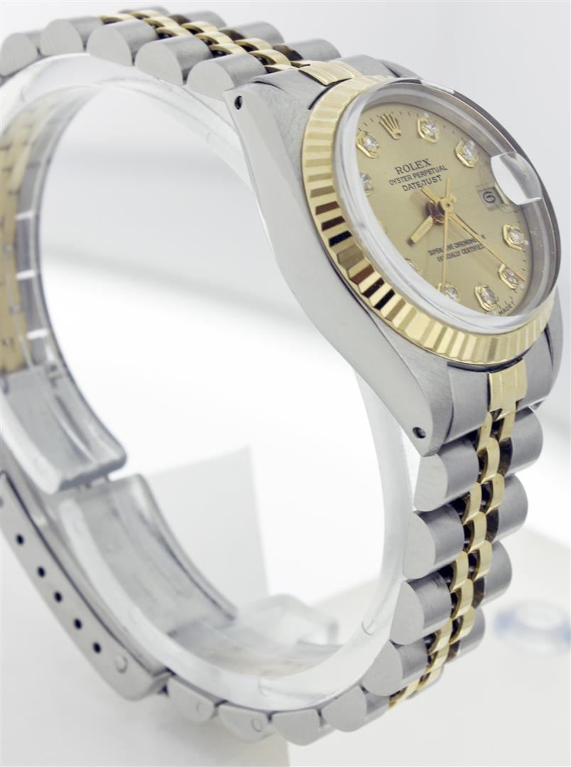 One Ladies Two Tone Rolex Datejust Polished, Serviced & Electronically Tested, 14K Yellow Gold & Stainless Steel Case:26mm, 14K Yellow Gold Crown, Bezel: 14K Yellow Gold Fluted Bezel. Custom Crystal: Acrylic Cyclops Lens. Movement: Automatic Winding Movement Caliber 2030. Custom Dial: Champagne with Diamond Hour Markers. 10 Diamonds In Dial, Clarity: Si-VS, Color: G to H. Date Window: 3 O'Clock Position Date Display, Non Quickset, Model: 6917 Condition: G-6 Extra Fine. Bracelet: Two Tone 14K Yellow Gold & Stainless Steel Jubilee. Bright Polish. 5.5 Inch Length, Adjustable. Standard Clasp, With Rolex Logo.