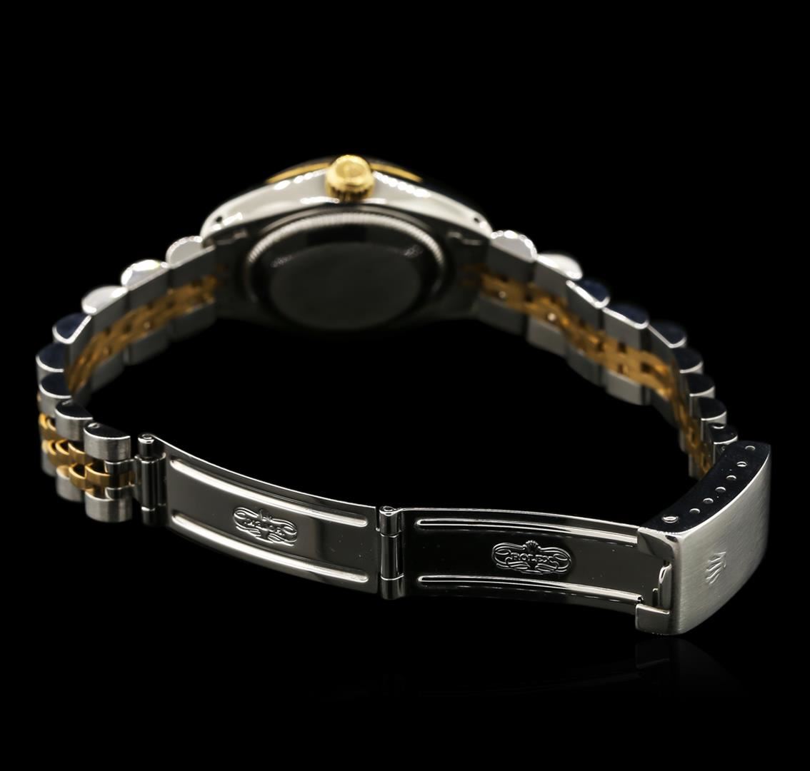 One ladies, hand crafted & machine milled Rolex two-tone DateJust wristwatch electronically tested; Circa: 1977, stainless steel Case: 25mm oyster, 14KT yellow gold Crown: twinlock with logo, 14KT yellow gold Bezel: fluted, Crystal: acrylic cyclops lens. Movement: superlative chronometer, Dial: Champagne color, with baton hands, indices, and a bordering minute track with five minute intervals, Date Window: 3 o'clock position non-quick set, Bracelet: two-tone stainless steel & 14KT yellow gold jubilee, Condition: G-5 Fine. Six inch length, adjustable. Standard clasp, with logo. Total Weight of Watch: 51.05 grams. Includes Rolex box. AIG Appraised at $5,880.00.