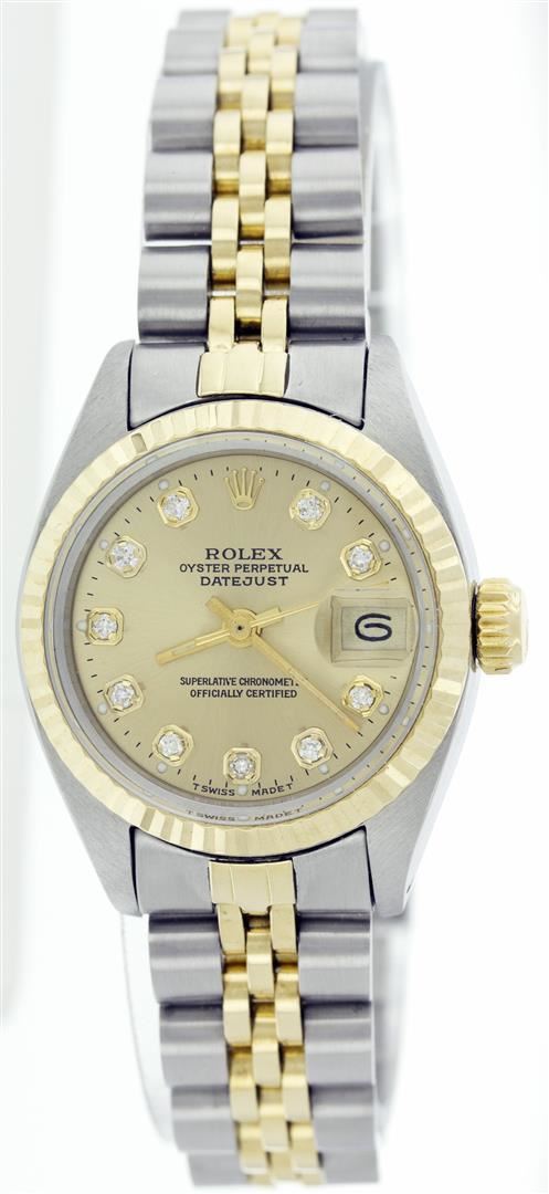 One Ladies Two Tone Rolex Datejust Polished, Serviced & Electronically Tested, 14K Yellow Gold & Stainless Steel Case:26mm, 14K Yellow Gold Crown, Bezel: 14K Yellow Gold Fluted Bezel. Custom Crystal: Acrylic Cyclops Lens. Movement: Automatic Winding Movement Caliber 2030. Custom Dial: Champagne with Diamond Hour Markers. 10 Diamonds In Dial, Clarity: Si-VS, Color: G to H. Date Window: 3 O'Clock Position Date Display, Non Quickset, Model: 6917 Condition: G-6 Extra Fine. Bracelet: Two Tone 14K Yellow Gold & Stainless Steel Jubilee. Bright Polish. 5.5 Inch Length, Adjustable. Standard Clasp, With Rolex Logo.