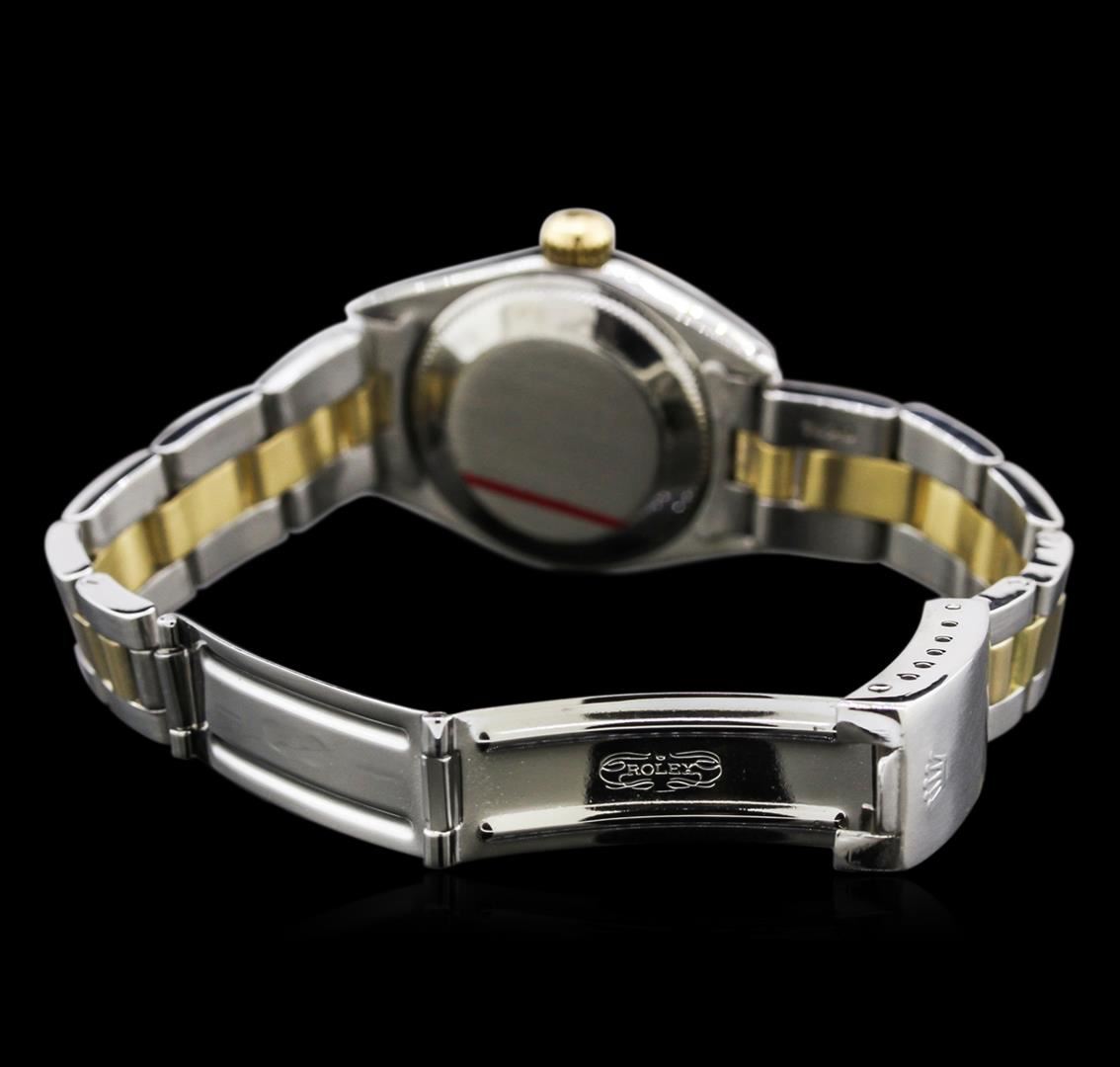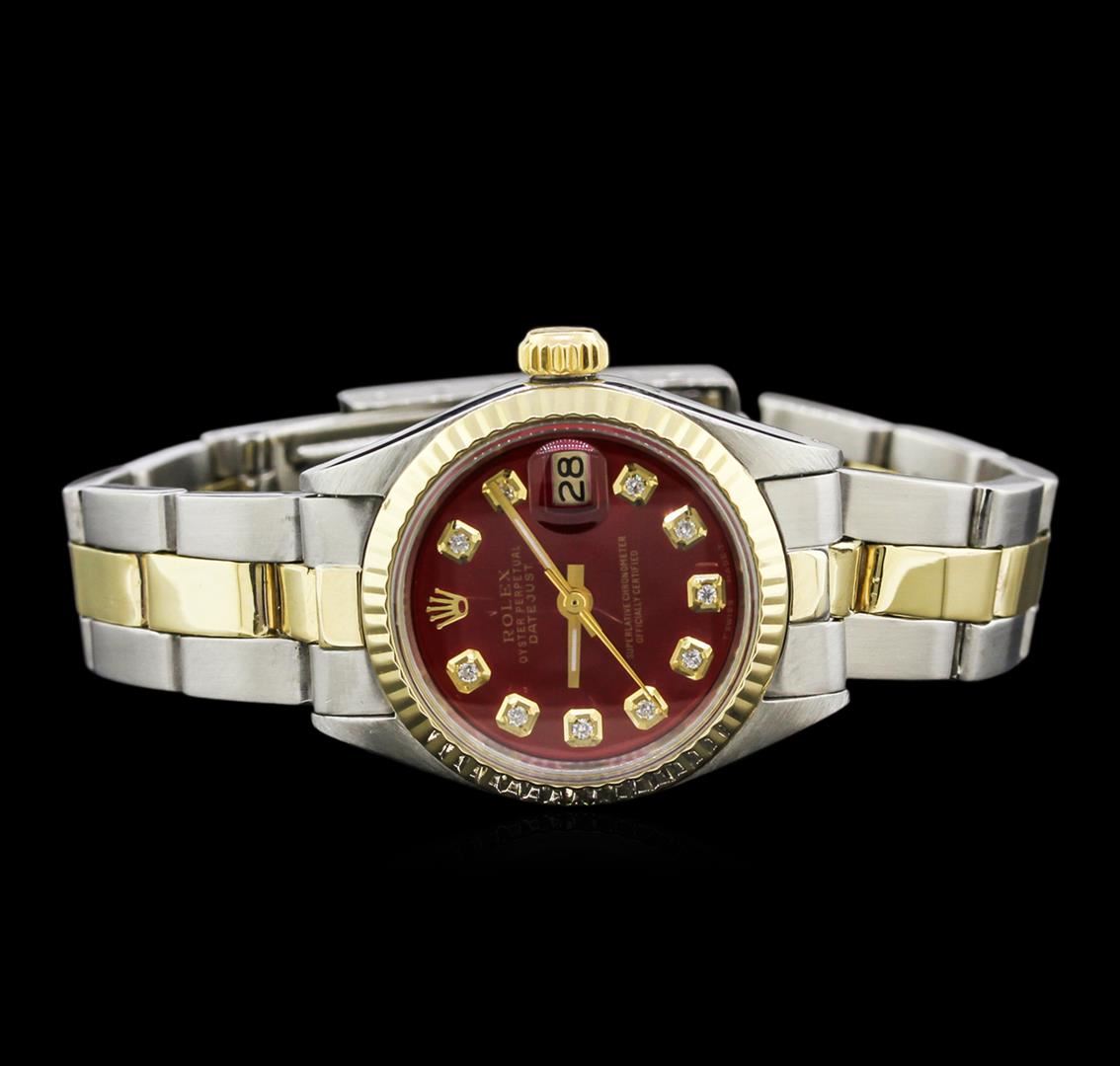 One ladies, hand crafted & machine milled Rolex two-tone DateJust wristwatch electronically tested; Circa: 1971, stainless steel Case: 26mm oyster, 14KT yellow gold Crown: twinlock with logo, 14KT yellow gold Bezel: fluted, non-factory custom Crystal: acrylic cyclops lens. Movement: automatic, non-factory custom Dial: Red color, with baton hands, and diamond markers, Date Window: 3 o'clock position non-quick set, Bracelet: two-tone stainless steel & 14KT yellow gold oyster link, Condition: G-5 Fine. Six and one quarter inch length, adjustable. Standard clasp, with logo. Total Weight of Watch 48.43gm. AIG Appraised at $5,770.00.