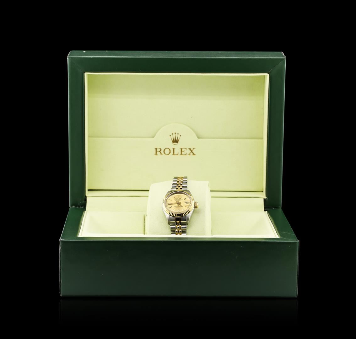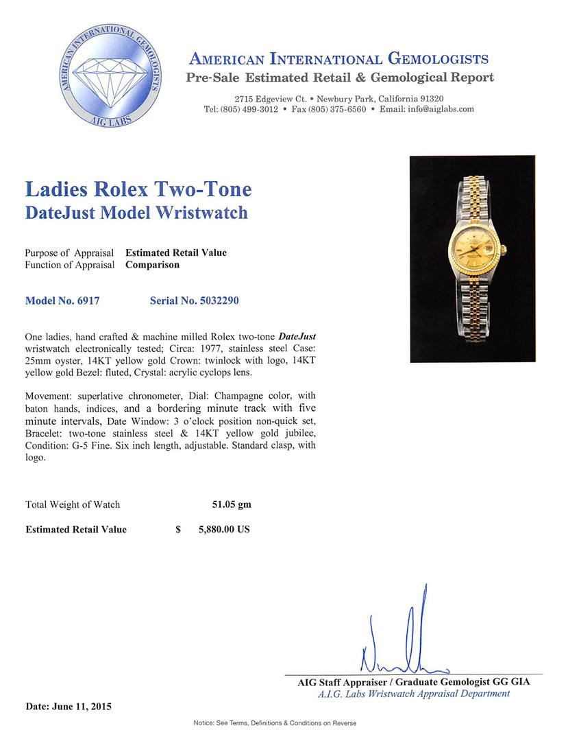 One ladies, hand crafted & machine milled Rolex two-tone DateJust wristwatch electronically tested; Circa: 1977, stainless steel Case: 25mm oyster, 14KT yellow gold Crown: twinlock with logo, 14KT yellow gold Bezel: fluted, Crystal: acrylic cyclops lens. Movement: superlative chronometer, Dial: Champagne color, with baton hands, indices, and a bordering minute track with five minute intervals, Date Window: 3 o'clock position non-quick set, Bracelet: two-tone stainless steel & 14KT yellow gold jubilee, Condition: G-5 Fine. Six inch length, adjustable. Standard clasp, with logo. Total Weight of Watch: 51.05 grams. Includes Rolex box. AIG Appraised at $5,880.00.