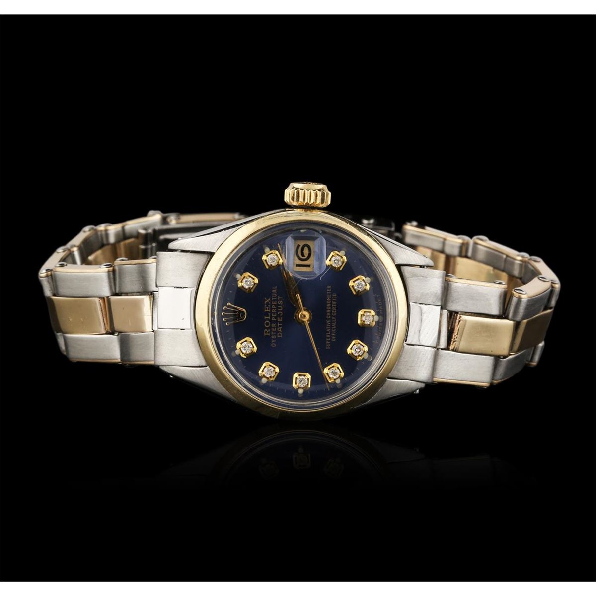 One ladies, hand crafted & machine milled Rolex two-tone DateJust wristwatch electronically tested; Circa: 1937, stainless steel Case: 25mm oyster, 14KT yellow gold Crown: twinlock with logo, 14KT yellow gold Bezel: high polish, Custom Crystal: acrylic cyclops lens. Movement: superlative chronometer, Custom Dial: Royal Blue color, with baton hands and diamond markers, Date Window: 3 o'clock position non-quick set, Bracelet: two-tone stainless steel & 14KT yellow gold oyster, Condition: G-4 Average. Six and one half inch length, adjustable. Standard clasp, with logo. Total Weight of Watch 37.39 grams. AIG Appraised at $4,550.00.