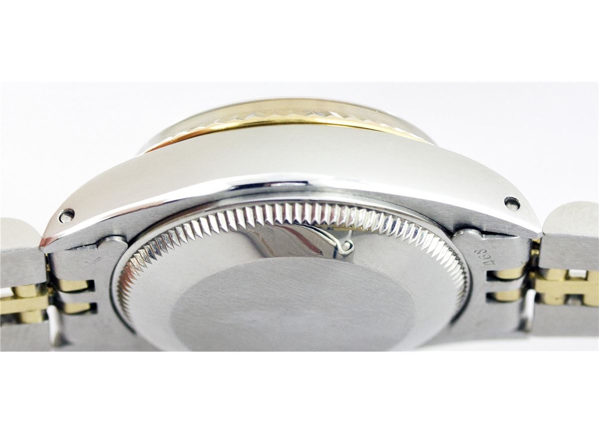 One Ladies Two Tone Rolex Datejust Polished, Serviced & Electronically Tested, 14K Yellow Gold & Stainless Steel Case:26mm, 14K Yellow Gold Crown, Bezel: 14K Yellow Gold Fluted Bezel. Custom Crystal: Acrylic Cyclops Lens. Movement: Automatic Winding Movement Caliber 2030. Custom Dial: Slate Grey With Roman Hour Markers. Date Window: 3 O'Clock Position Date Display, Non Quickset, Model: 6917 Condition: G-6 Extra Fine. Bracelet: Two Tone 14K Yellow Gold & Stainless Steel Jubilee. Bright Polish. 5.5 Inch Length, Adjustable. Standard Clasp, With Rolex Logo.