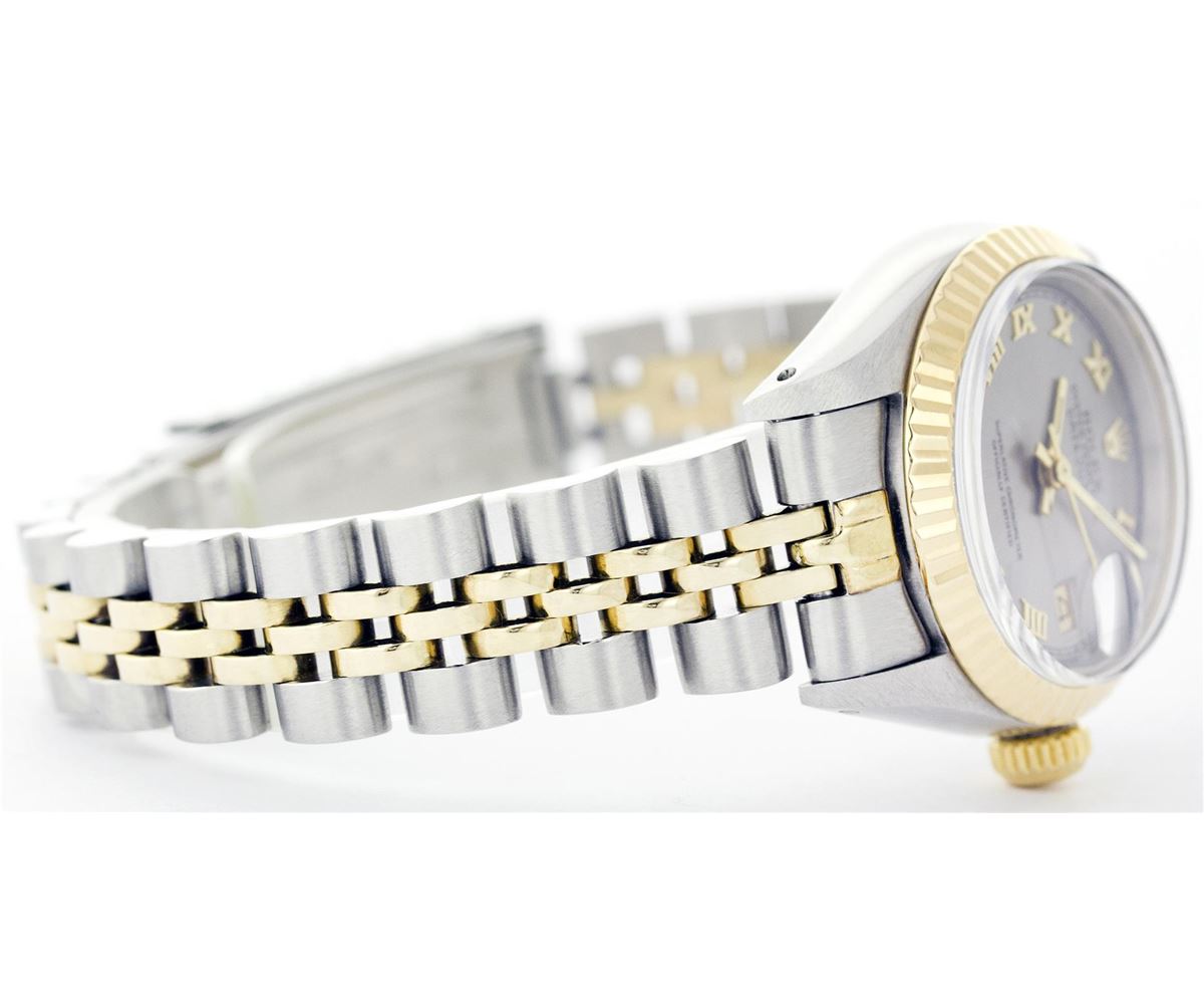 One Ladies Two Tone Rolex Datejust Polished, Serviced & Electronically Tested, 14K Yellow Gold & Stainless Steel Case:26mm, 14K Yellow Gold Crown, Bezel: 14K Yellow Gold Fluted Bezel. Custom Crystal: Acrylic Cyclops Lens. Movement: Automatic Winding Movement Caliber 2030. Custom Dial: Slate Grey With Roman Hour Markers. Date Window: 3 O'Clock Position Date Display, Non Quickset, Model: 6917 Condition: G-6 Extra Fine. Bracelet: Two Tone 14K Yellow Gold & Stainless Steel Jubilee. Bright Polish. 5.5 Inch Length, Adjustable. Standard Clasp, With Rolex Logo.
