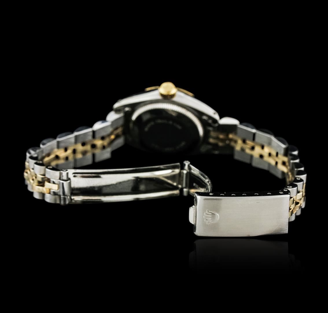 One ladies, hand crafted & machine milled Rolex DateJust Model wristwatch electronically tested, Stainless Steel Case: 26mm oyster, 14KT yellow gold Crown: twinlock with logo, 14KT yellow gold Bezel: fluted, Crystal: acrylic clops lens. Movement: superlative chronometer. Custom Dial: mother of pearl, with baton hands, and diamond markers, Date Window: 3 o'clock position date display, non-quick set, Circa: 1979, Condition: G-4 Average. Bracelet: stainless steel and 14KT yellow gold jubilee. Bright polish & brushed finish. Seven inch length, adjustable. Standard clasp, with logo. Total Weight of Watch 51.14 grams. AIG Appraised at $6,770.00.