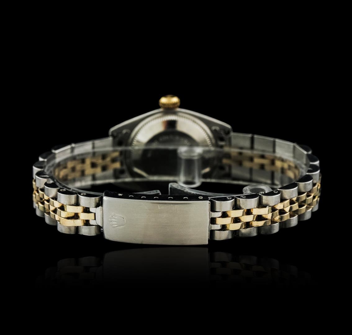 One ladies, hand crafted & machine milled Rolex DateJust Model wristwatch electronically tested, Stainless Steel Case: 26mm oyster, 14KT yellow gold Crown: twinlock with logo, 14KT yellow gold Bezel: fluted, Crystal: acrylic clops lens. Movement: superlative chronometer. Custom Dial: mother of pearl, with baton hands, and diamond markers, Date Window: 3 o'clock position date display, non-quick set, Circa: 1979, Condition: G-4 Average. Bracelet: stainless steel and 14KT yellow gold jubilee. Bright polish & brushed finish. Seven inch length, adjustable. Standard clasp, with logo. Total Weight of Watch 51.14 grams. AIG Appraised at $6,770.00.