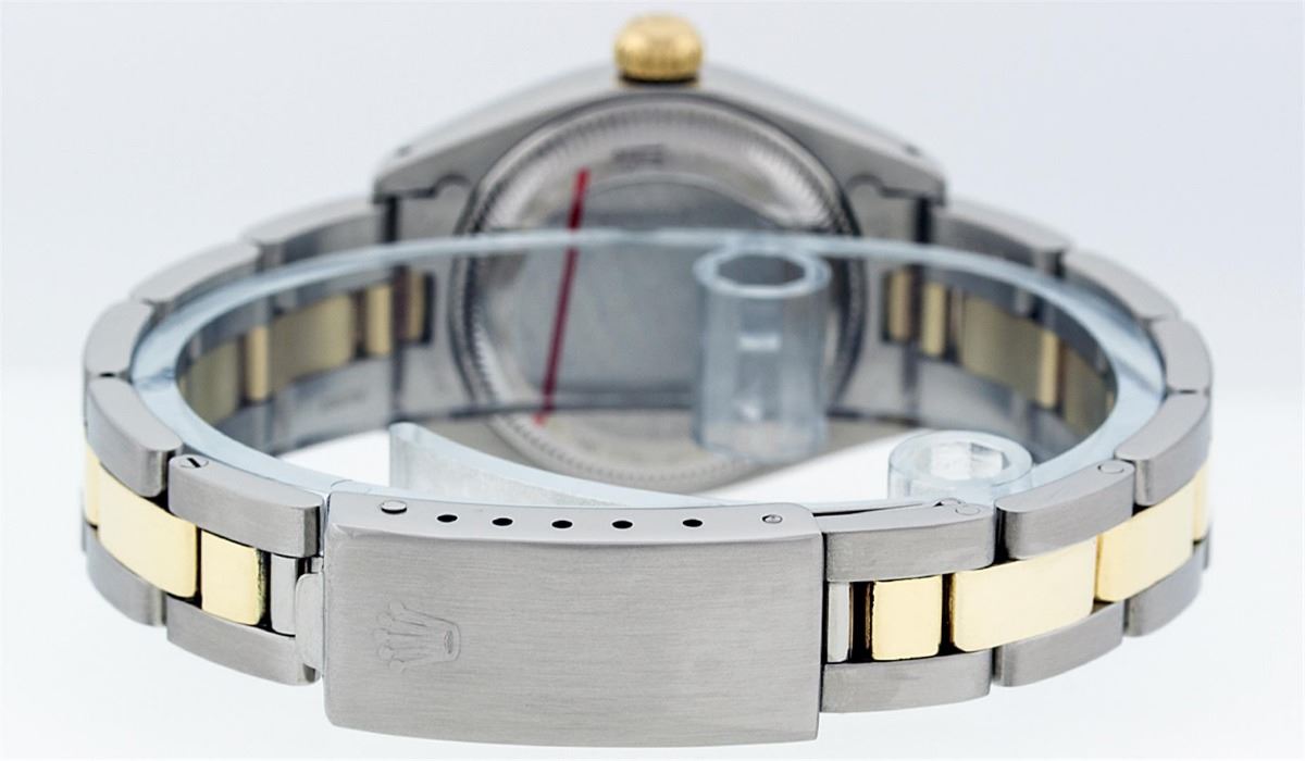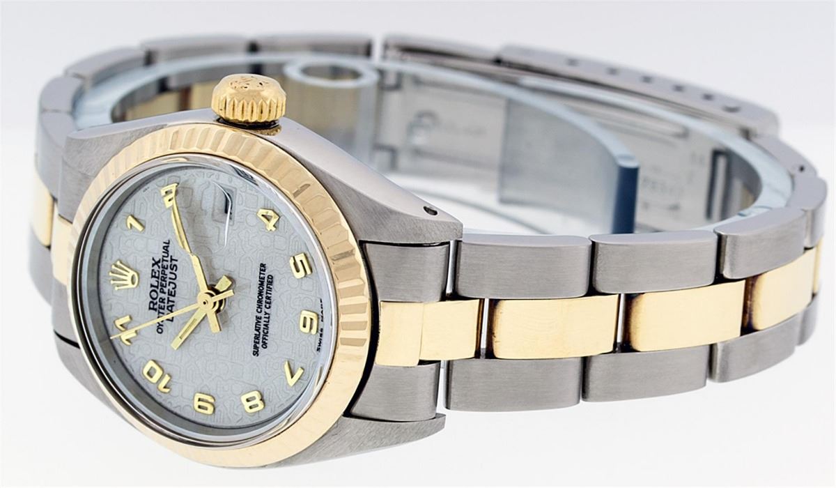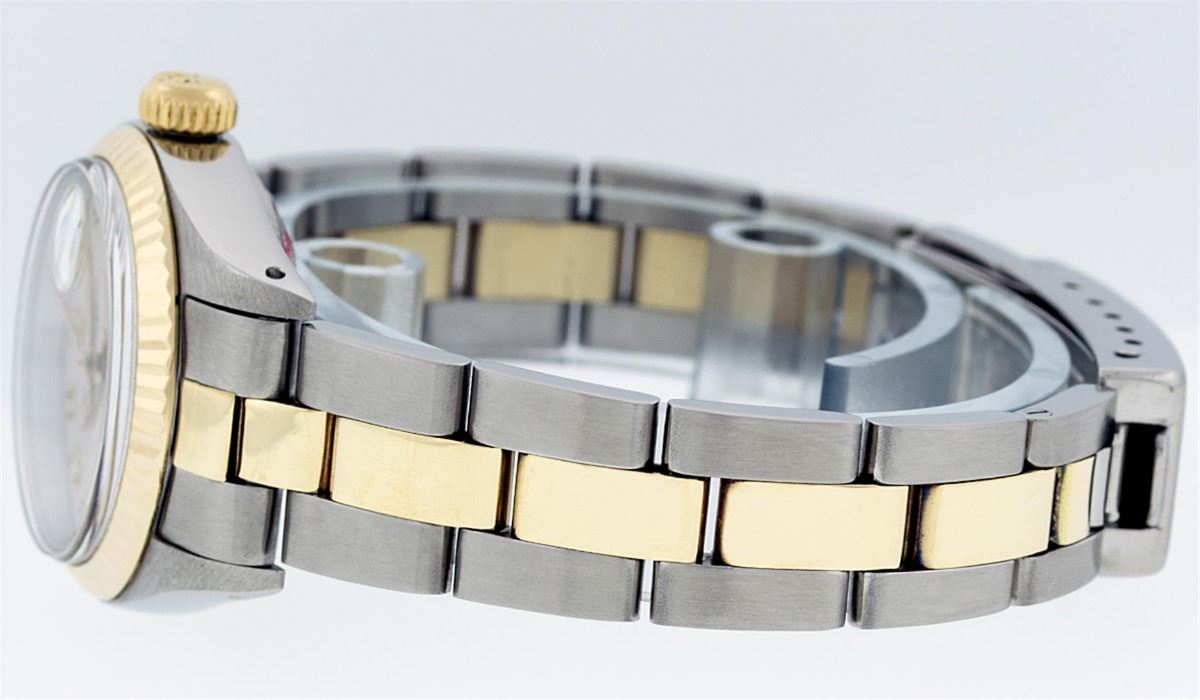 One Ladies Two Tone Rolex Datejust Polished, Serviced & Electronically Tested, 14K Yellow Gold & Stainless Steel Case:26mm, 14K Yellow Gold Crown, Bezel: 14K Yellow Gold Fluted Bezel. Custom Crystal: Acrylic Cyclops Lens. Movement: Automatic Winding Movement Caliber 2030. Dial: White Jubilee Arabic Dial. Date Window: 3 O'Clock Position Date Display, Model: Datejust. Condition: G-6 Extra Fine. Bracelet: Two Tone 14K Yellow Gold & Stainless Steel Jubilee Band. Bright Polish. 6.0 Inch Length, Adjustable. Standard Clasp, With Rolex Logo. Comes with 6 month warranty.
