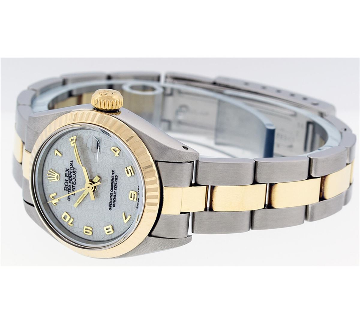 One Ladies Two Tone Rolex Datejust Polished, Serviced & Electronically Tested, 14K Yellow Gold & Stainless Steel Case:26mm, 14K Yellow Gold Crown, Bezel: 14K Yellow Gold Fluted Bezel. Custom Crystal: Acrylic Cyclops Lens. Movement: Automatic Winding Movement Caliber 2030. Dial: White Jubilee Arabic Dial. Date Window: 3 O'Clock Position Date Display, Model: Datejust. Condition: G-6 Extra Fine. Bracelet: Two Tone 14K Yellow Gold & Stainless Steel Jubilee Band. Bright Polish. 6.0 Inch Length, Adjustable. Standard Clasp, With Rolex Logo. Comes with 6 month warranty.