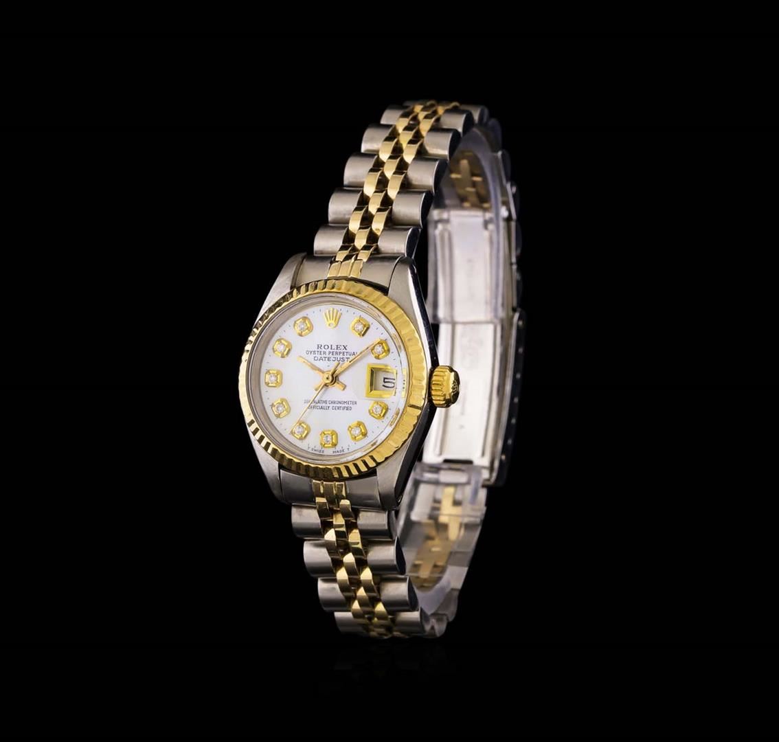 One ladies, hand crafted & machine milled Rolex DateJust Model wristwatch electronically tested, Stainless Steel Case: 26mm oyster, 14KT yellow gold Crown: twinlock with logo, 14KT yellow gold Bezel: fluted, Crystal: acrylic clops lens. Movement: superlative chronometer. Custom Dial: mother of pearl, with baton hands, and diamond markers, Date Window: 3 o'clock position date display, non-quick set, Circa: 1979, Condition: G-4 Average. Bracelet: stainless steel and 14KT yellow gold jubilee. Bright polish & brushed finish. Seven inch length, adjustable. Standard clasp, with logo. Total Weight of Watch 51.14 grams. AIG Appraised at $6,770.00.