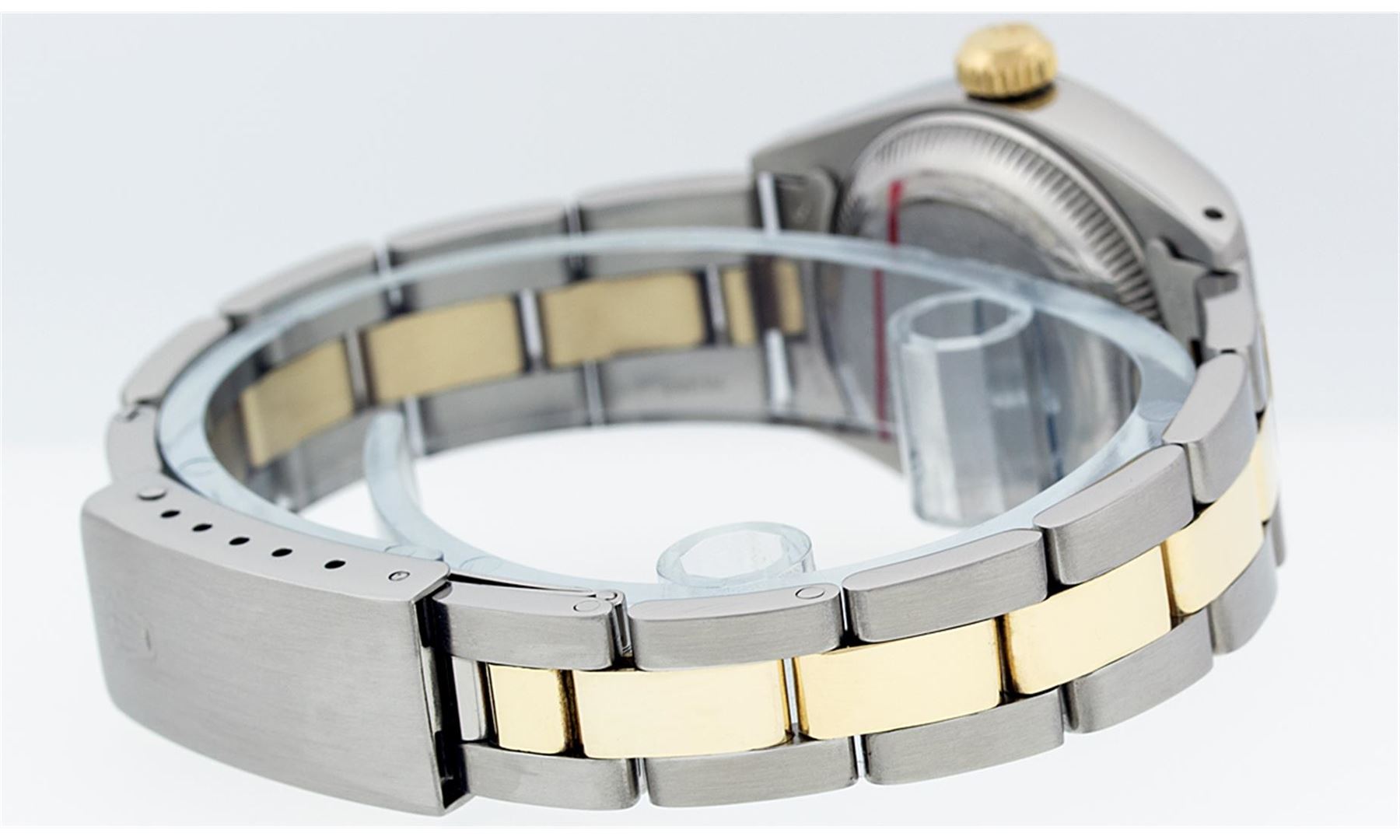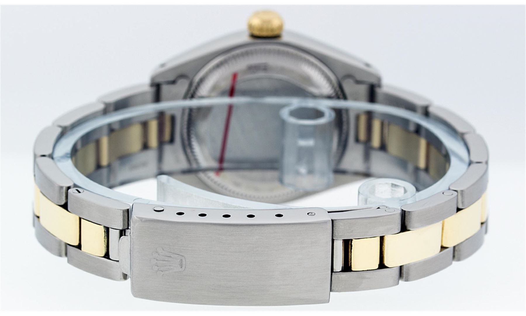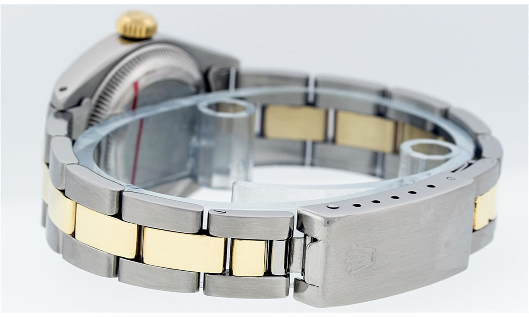 One Ladies Two Tone Rolex Datejust Polished, Serviced & Electronically Tested, 14K Yellow Gold & Stainless Steel Case:26mm, 14K Yellow Gold Crown, Bezel: 14K Yellow Gold Fluted Bezel. Custom Crystal: Acrylic Cyclops Lens. Movement: Automatic Winding Movement Caliber 2030. Dial: White Jubilee Arabic Dial. Date Window: 3 O'Clock Position Date Display, Model: Datejust. Condition: G-6 Extra Fine. Bracelet: Two Tone 14K Yellow Gold & Stainless Steel Jubilee Band. Bright Polish. 6.0 Inch Length, Adjustable. Standard Clasp, With Rolex Logo. Comes with 6 month warranty.