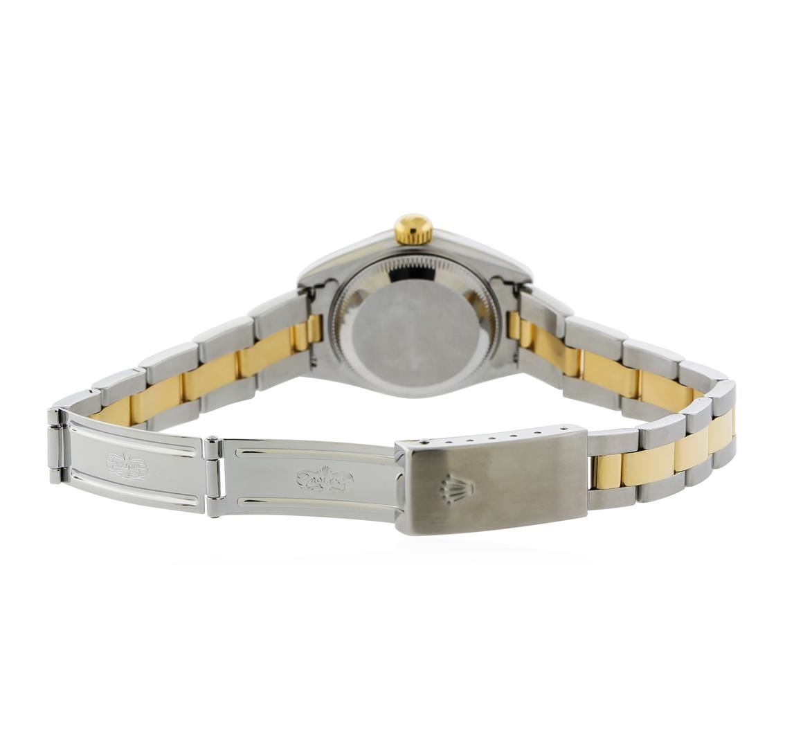 One ladies, hand crafted & machine milled Rolex DateJust Model wristwatch electronically tested. Stainless Steel Rolex Oyster Case: 26mm oyster, 18KT yellow gold Crown: twinlock with high relief logo, 18KT yellow gold Bezel: fluted, Rolex Hallmarked Crystal: synthetic sapphire cyclops lens. Circa: 2002.Movement: superlative chronometer automatic, Rolex signed Dial: Ivory color pyramid dial, with baton hands & raised Roman numerals, Calendar: 3 o'clock position date display, quick set, Condition: G-6 Extra Fine, Rolex Bracelet: stainless steel and 18KT yellow gold oyster links. Seven and one half inch length, adjustable. Rolex Hallmarked clasp, with high relief logo. Total Weight of Watch 59.16gm. AIG Appraised at $7,750.00.