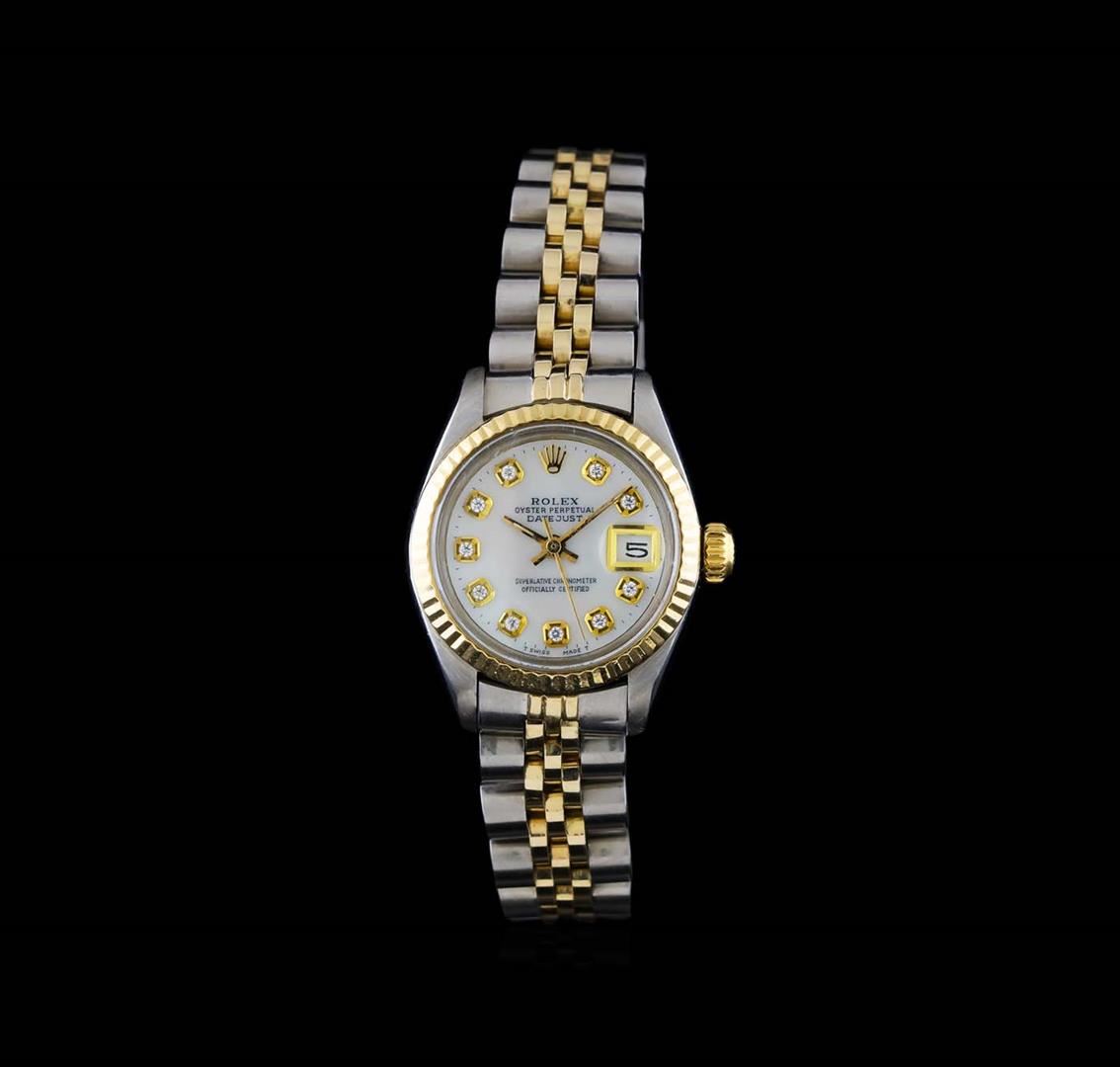 One ladies, hand crafted & machine milled Rolex DateJust Model wristwatch electronically tested, Stainless Steel Case: 26mm oyster, 14KT yellow gold Crown: twinlock with logo, 14KT yellow gold Bezel: fluted, Crystal: acrylic clops lens. Movement: superlative chronometer. Custom Dial: mother of pearl, with baton hands, and diamond markers, Date Window: 3 o'clock position date display, non-quick set, Circa: 1979, Condition: G-4 Average. Bracelet: stainless steel and 14KT yellow gold jubilee. Bright polish & brushed finish. Seven inch length, adjustable. Standard clasp, with logo. Total Weight of Watch 51.14 grams. AIG Appraised at $6,770.00.